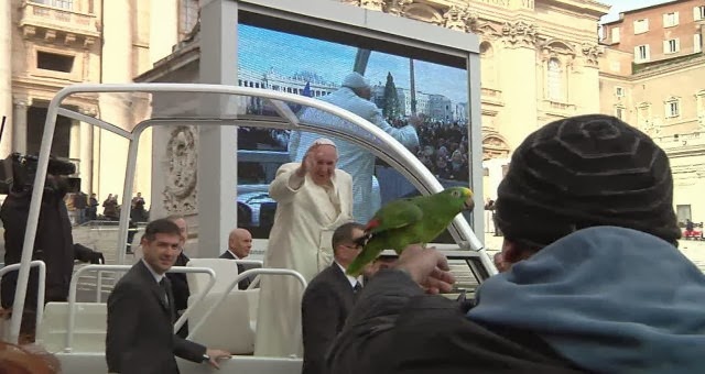 A few days after Francis had two children let go of two ‘peace’ doves, from the Apostolic window, which were in turn attacked by a seagull and a crow another incident took place concerning Francis & a bird.  During his general audience on Wednesday, Francis had the Pope-mobile double-back so he could bless a parrot he saw in the crowd.  Francis took the bird on his finger made a few remarks about its plumage and had his photo-op. The parrot was named Amore, in English (to) love, and repeated the word which the audience was chanting, “Papa!” The bird belonged to an interesting person named Francesco ‘Ghyblj’ Lombardi.