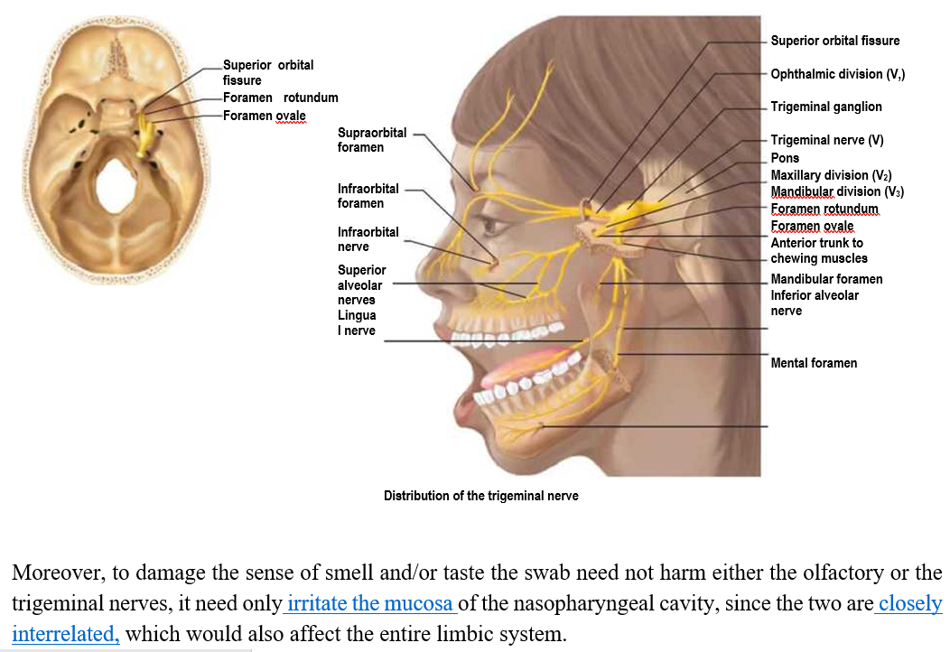 Długa wymazówka włożona do jamy nosowo-gardłowej aż do podniebienia w celu pobrania resztek wirusowego RNA z błony śluzowej nosa, tkanki wyścielającej jamę nosową, uszkadza pęczki nerwu węchowego, co jak się okazuje , ma tragiczne konsekwencje dla zdrowia i długości życia człowieka, ponieważ nerw węchowy jest jednym z dwóch okien w czaszce, przez które wirusy i bakterie mogą przemieszczać się z nosa do mózgu, a tym samym przekraczać barierę krew-mózg, a drugim jest nerw trójdzielny .
