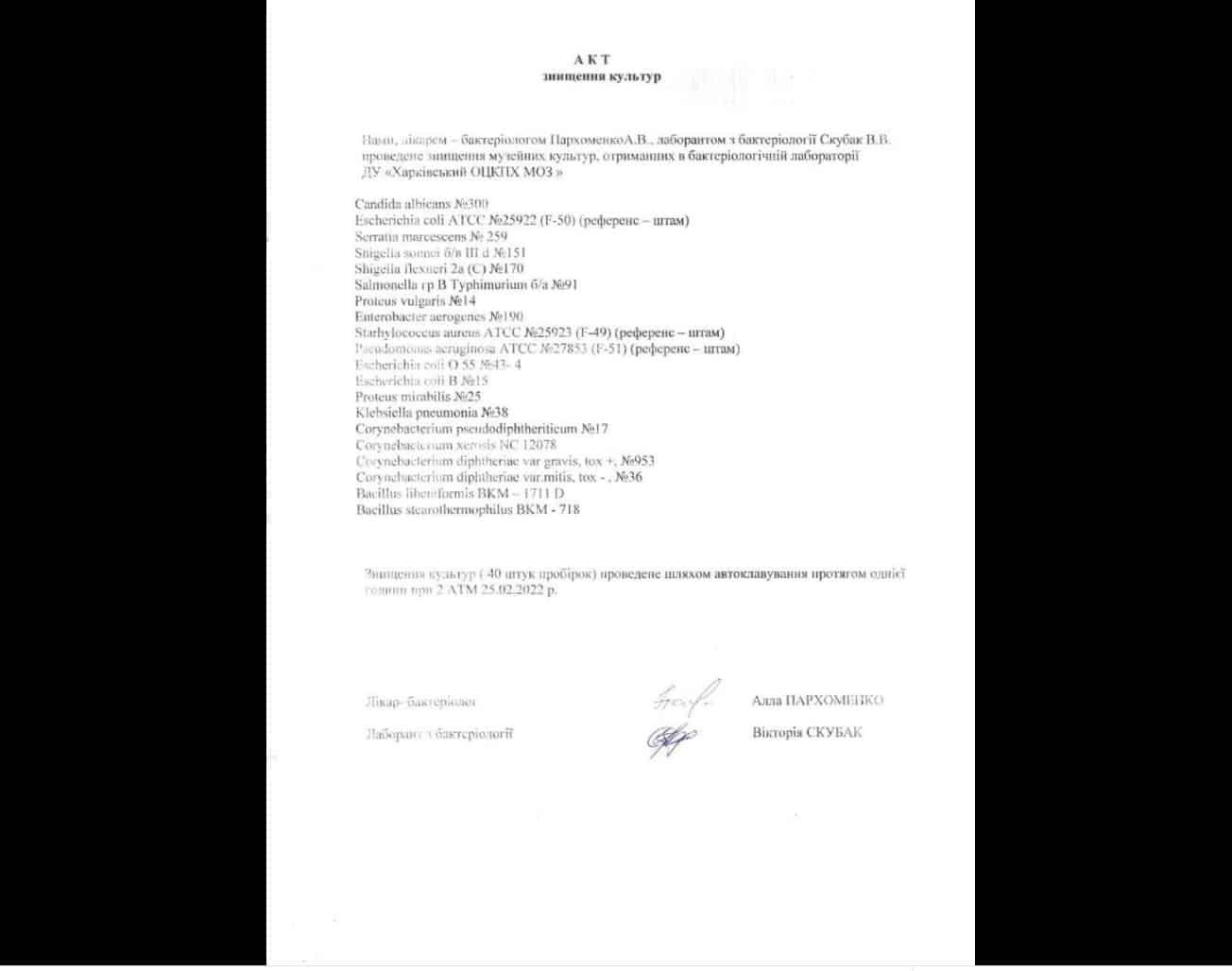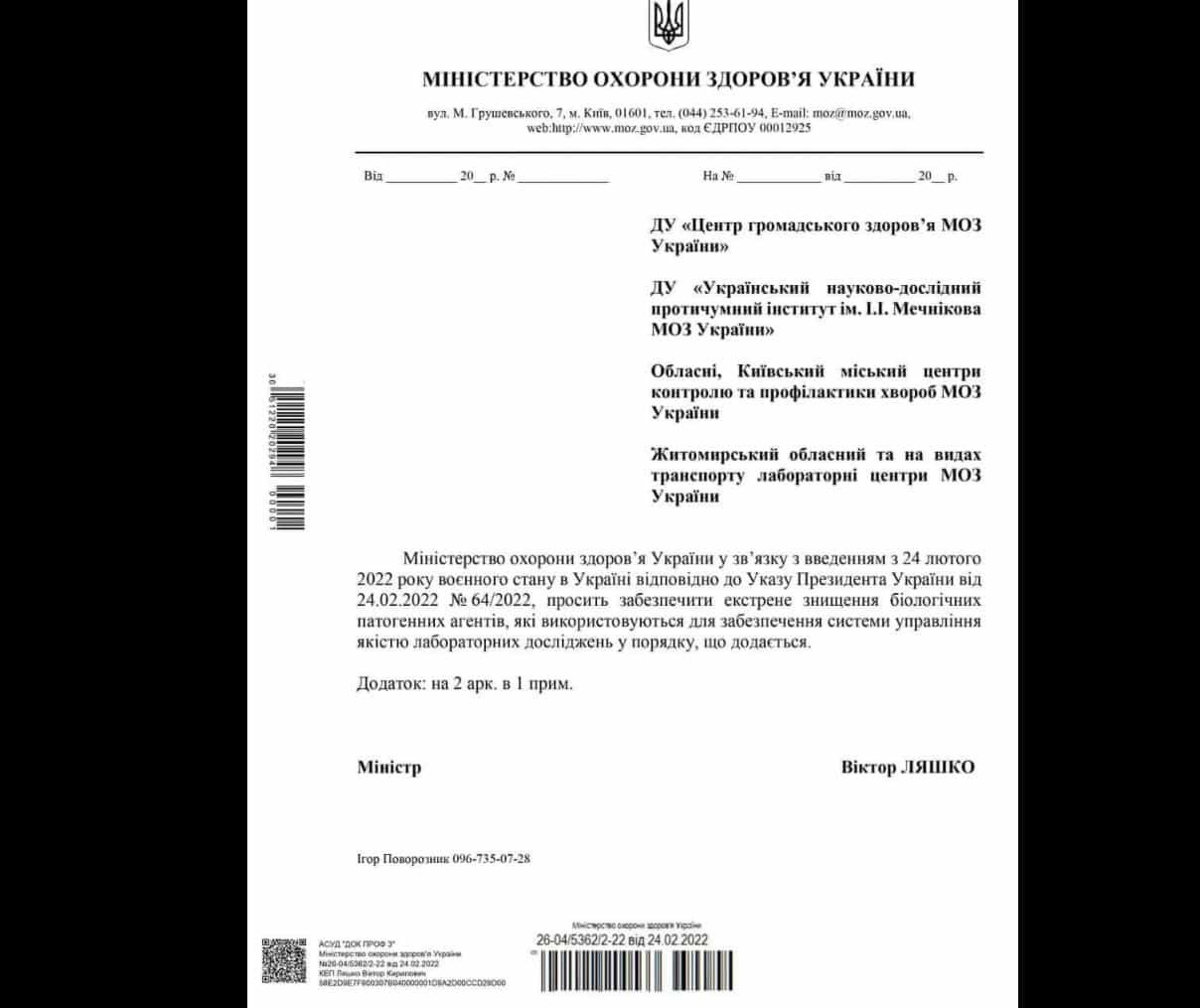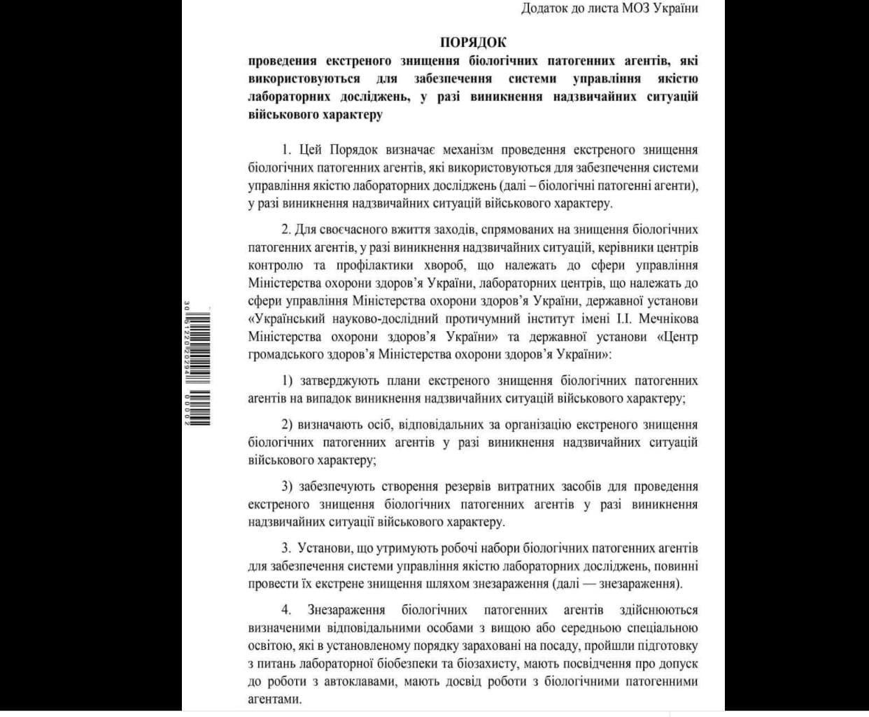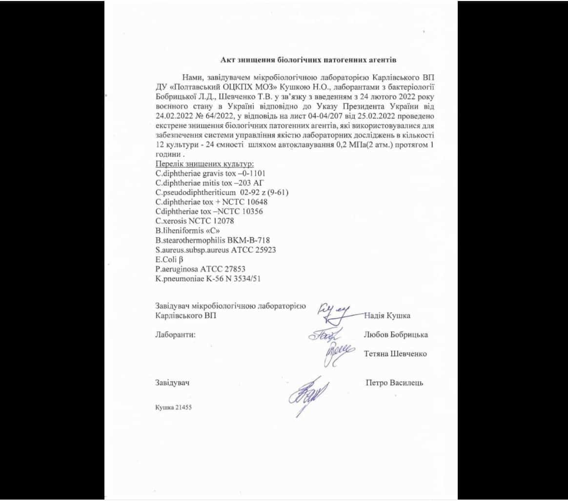 “The documents received confirm that biological weapons components were being developed in Ukrainian biolaboratories in close proximity to Russia. In the near future we will present the results of the analysis of the documents received. Some of them, in particular, the instruction of the Ministry of Health of Ukraine on the destruction of pathogens and acts of destruction in Poltava and Kharkiv biological laboratories, we are publishing right now,” the official representative of the Russian Defense Ministry said.
