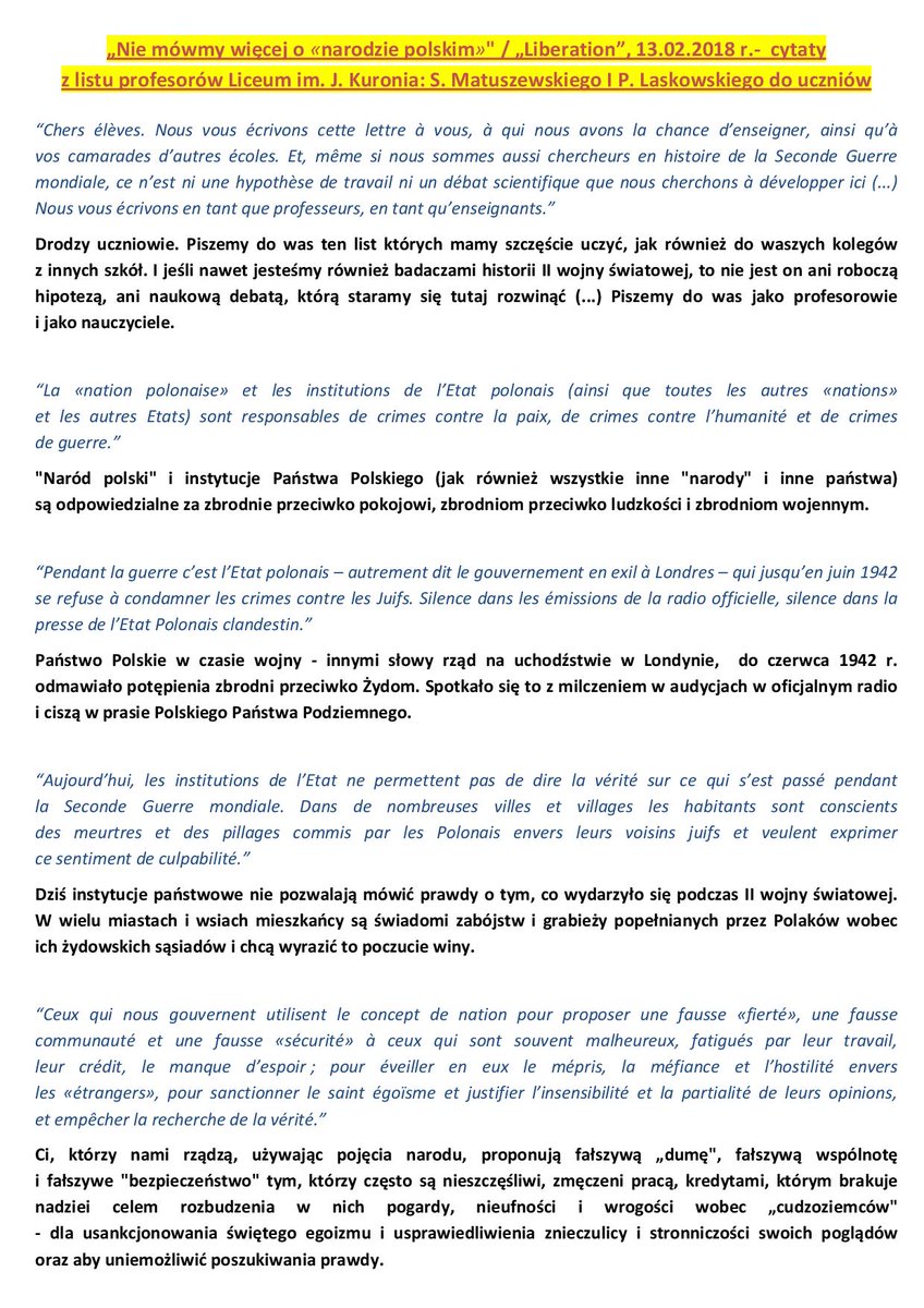 Piszemy ten list do was, którym mamy szczęście uczyć i do waszych kolegów z innych szkół. I chociaż jesteśmy również badaczami w historii II wojny światowej, nie jest to ani robocza hipoteza, ani debata naukowa, którą staramy się tutaj rozwijać. Ten list też nie jest artystyczną interwencją. Piszemy do was jako nauczyciele, jako nauczyciele.