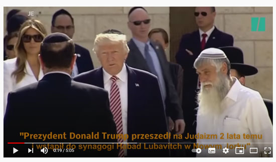 Okazało się jednak, że D. Trump poszedł w swoim serwilizmie jeszcze dalej. Mimo przynależności do kościoła protestanckiego, pozornie chrześcijańskiego choć wymyślonego i całkowicie kontrolowanego przez żydów, postanowił stać się żydem pełną gębą. Niespełna cztery lata temu, w głębokiej tajemnicy przed opinią publiczną, przeszedł na judaizm akurat w wersji Chabat Lubawicz – tej samej, którą wyznaje zięć i zarazem patologicznie nienawidzącej chrześcijaństwa. Dodajmy przy okazji, że David Elias Goldberg, żydowski publicysta, adwokat i działacz społeczny, który ujawnił ten fakt 23 lutego 2019 roku zginął w niewyjaśnionych okolicznościach cztery miesiące później.