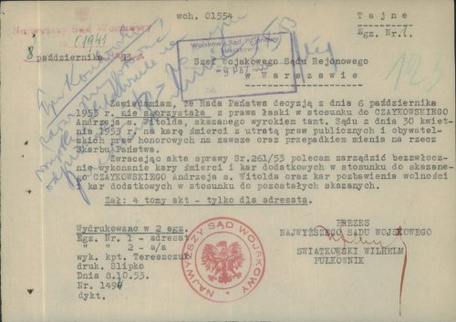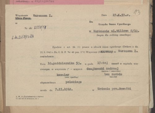 W taki sposób Urząd Stanu Cywilnego dowiadywał się o śmierci ofiar mordów w imieniu PRL: o faktycznie zamordowanym Andrzeju Czaykowskim - zmarł w szpitalu więziennym, w więzieniu (s. 1). Z zasobu IPN