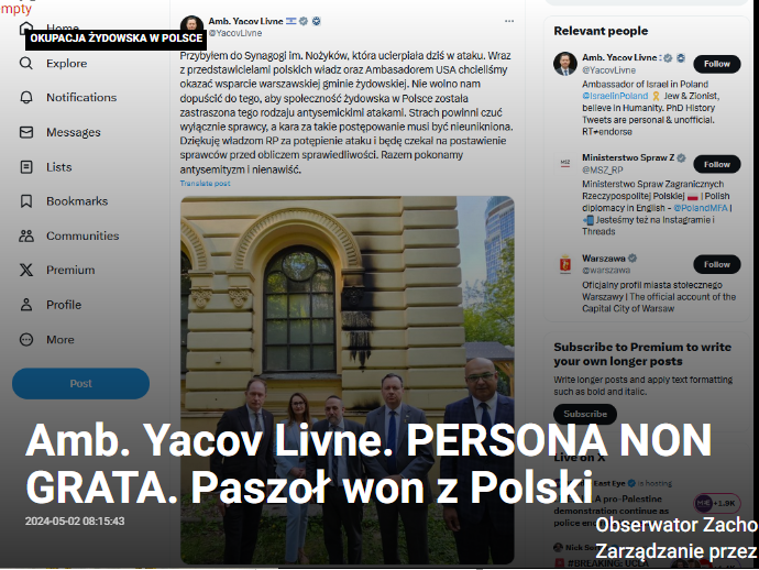 Amb. Yacov Livne. PERSONA NON GRATA. Paszoł won z Polski(Okupacja żydowska w Polsce)Yacov Livne – rzekomy ambasador rzekomego państwa „Izrael” kolejny już raz łamie protokół dyplomatyczny w Polsce, tym razem, do spółki z tym pachołkiem Brzezińskim. Bo podpalanie synagog w Polsce to wewnętrzna ...