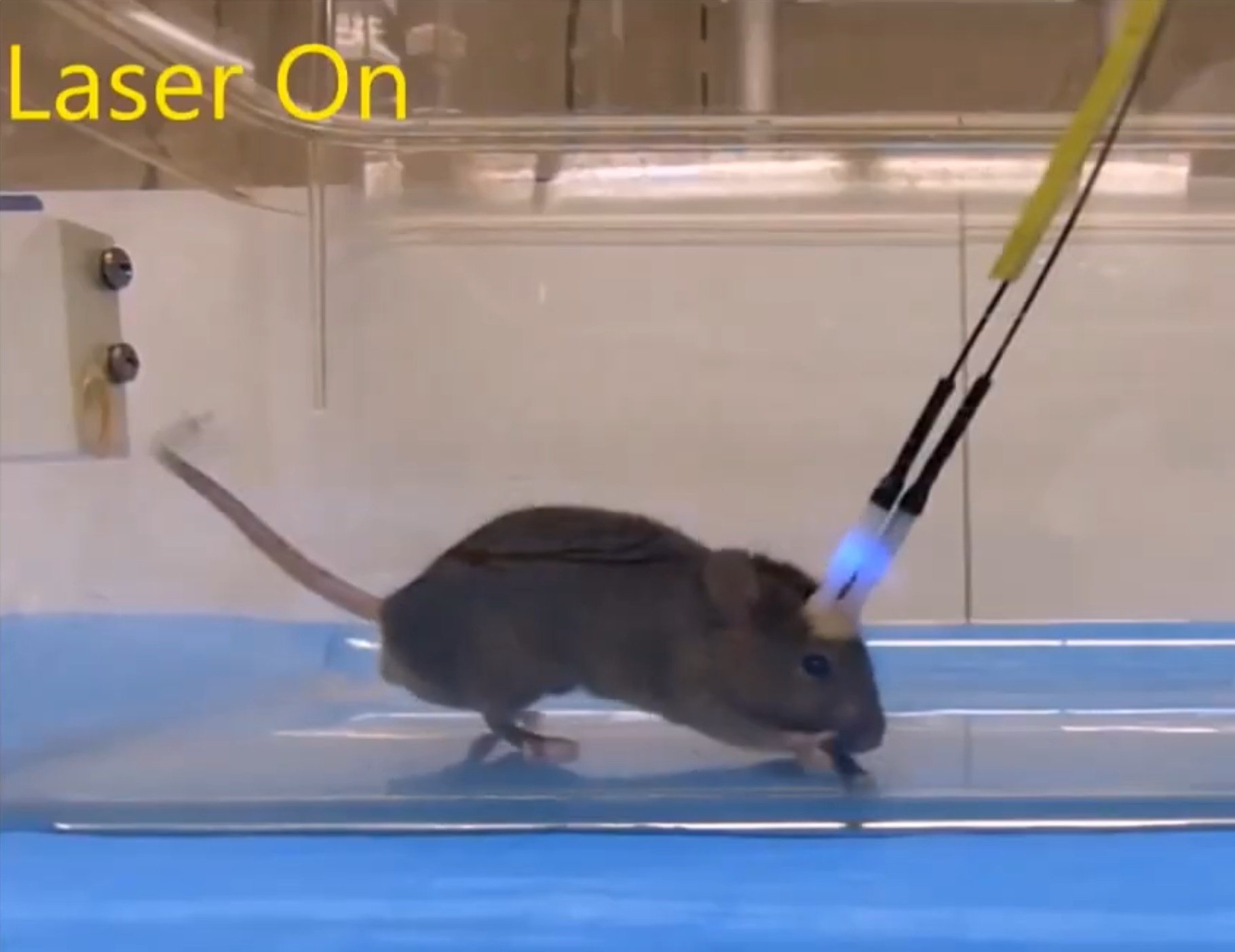 Niebieskie światło przymocowane do czaszki myszy zapala się.