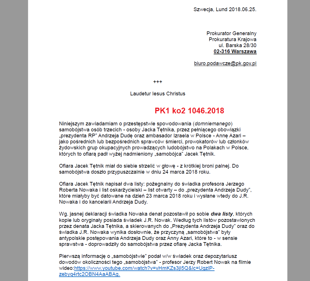 „….o przestępstwie spowodowania (domniemanego) samobójstwa osób trzecich - osoby Jacka Tętnika, przez pełniącego obowiązki „prezydenta RP” Andrzeja Dudę oraz ambasador Izraela w Polsce - Annę Azari – jako pośrednich lub bezpośrednich sprawców śmierci, prowokatorów lub członków żydowskich grup okupacyjnych prowadzących ludobójstwo na Polakach w Polsce, których to ofiarą padł wyżej nadmieniony „samobójca” Jacek Tętnik.”