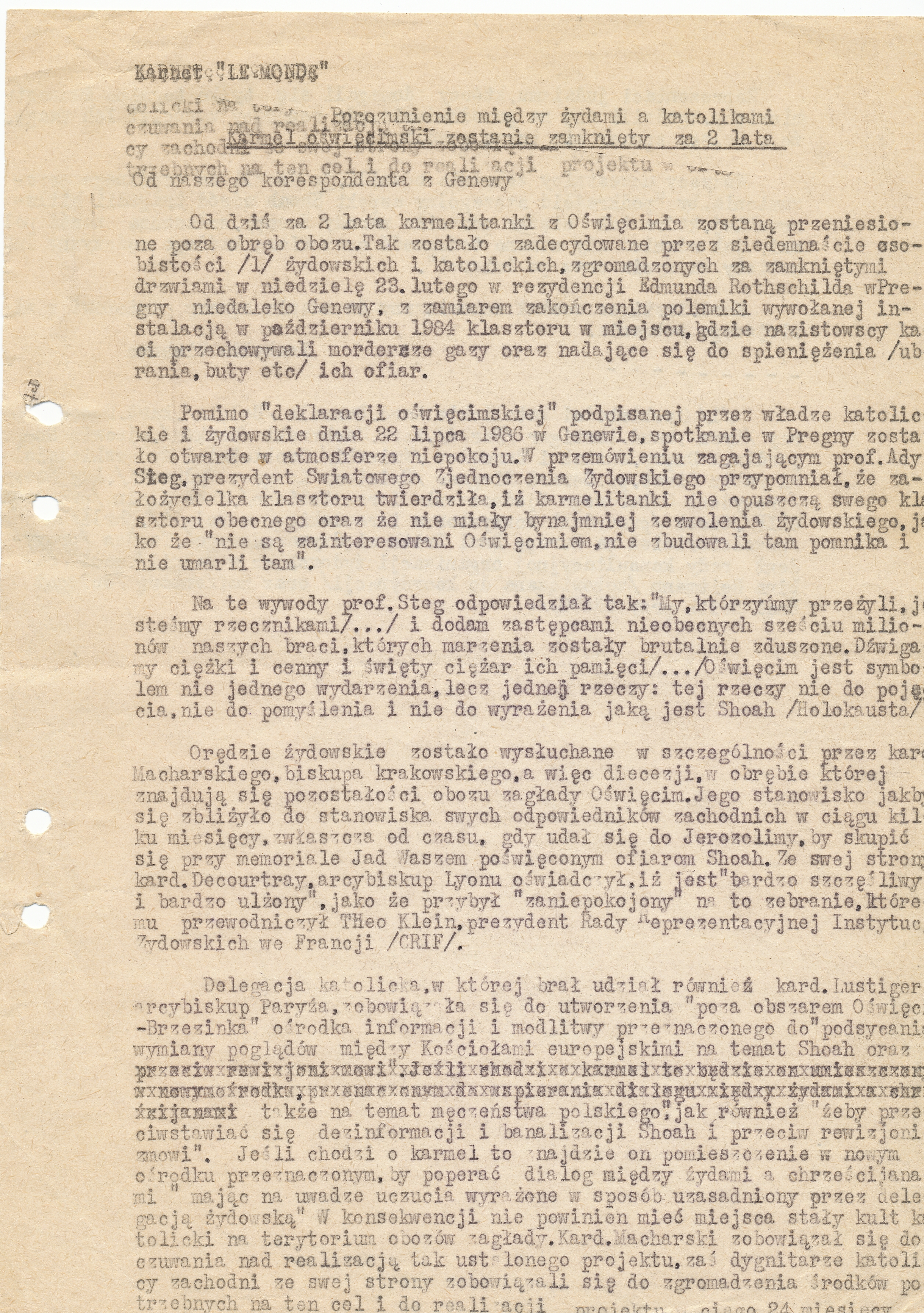 Od dziś za 2 lata, karmelitanki z Oświęcimia zostaną przeniesione poza obręb obozu. Tak zostało zadecydowane przez siedemnaście osobistości i żydowskich i katolickich, zgromadzonych za zamkniętymi drzwiami w niedzielę 23 lutego w rezydencji Edmunda Rothschilda w Pregny niedaleko Genewy, z zamiarem zakończenia polemiki wywołanej instalacją w październiku 1984 klasztoru w miejscu gdzie nazistowscy kaci przechowywali mordercze gazy oraz nadające się do spieniężenia ( ubrania, buty etc.) ich ofiar.