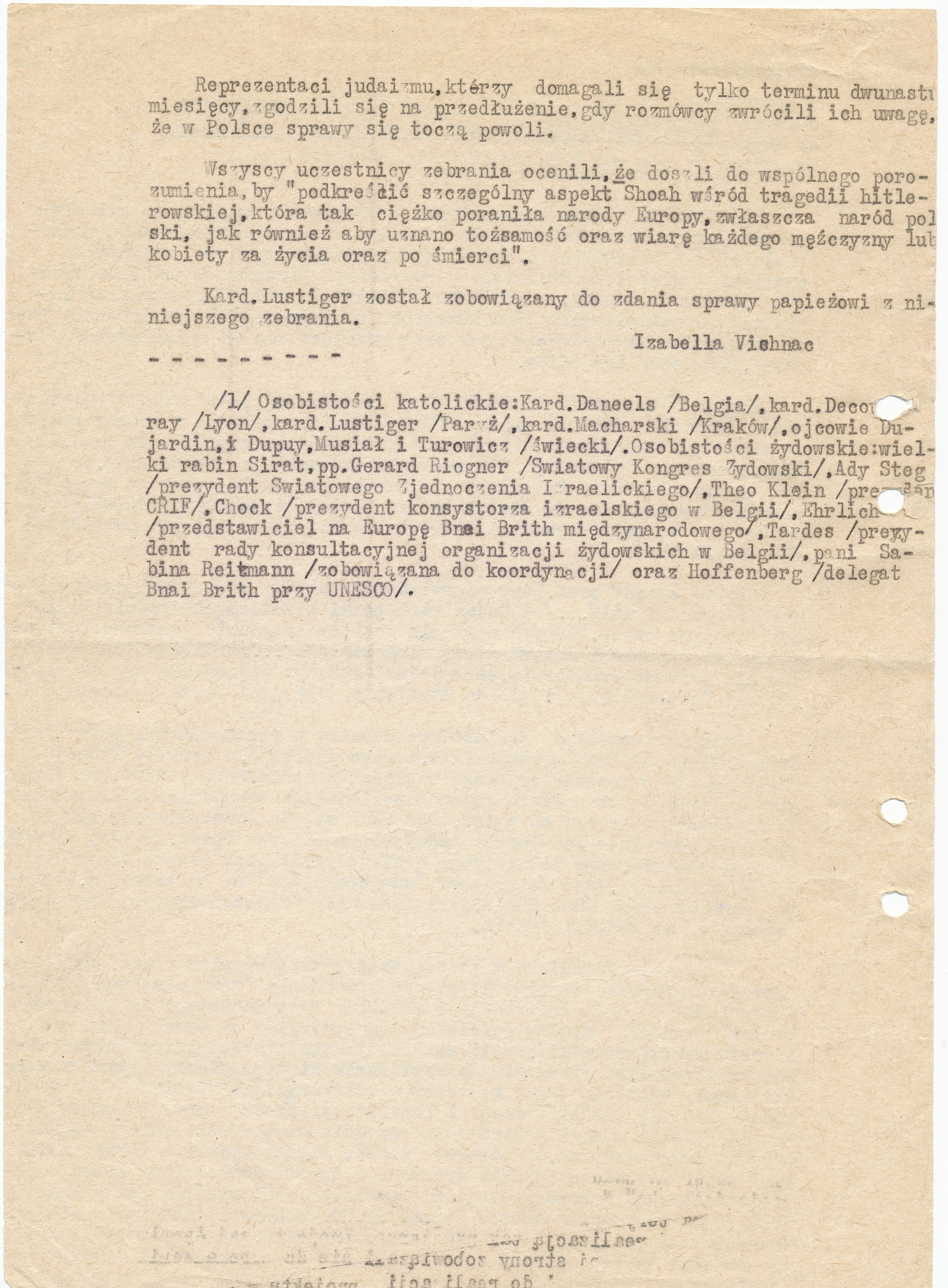 Wszyscy uczestnicy zebrania ocenili, że doszli do wspólnego porozumienia, by "podkreślić" szczególny aspekt Shoah wśród tragedii hitlerowskiej, która tak ciężko poraniła narody Europy, zwłaszcza naród polski, jak również aby uznano tożsamość oraz wiarę każdego mężczyzny lub kobiety za życia oraz po śmierci".