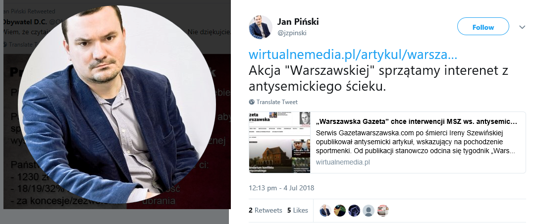 „Warszawska Gazeta” stała się obiektem takiej właśnie operacji bliżej nieznanych służb. Kilka lat temu powołano podszywającą się pod naszą gazetę stronę internetową „Gazeta Warszawska”. Zamieszcza ona absurdalne antysemickie teksty, które często miesza z treściami ukradzionymi z naszej gazety. W ten sposób próbuje uzasadniać oskarżenie naszego tygodnika o szerzenie antysemityzmu. Nie ma wątpliwości, że mamy do czynienia z profesjonalistami. Portal zmienia często miejsce rejestracji. Tylko w ostatnim czasie były to: Szwecja, Holandia i Kanada. „Firmuje” ów portal bliżej nieznany Krzysztof Cierpisz, rzekomo zamieszkujący Szwecję. Prawdę trudno ustalić, pozwu mu doręczyć nie sposób. Jego działalność jest bardzo na rękę wielu osobom, dla których stanowi potwierdzenie, że oskarżania Polaków o antysemityzm są zasadne. Posiłkując się tym obrzydliwym portalem, pomawiał nas o antysemityzm m.in. radny Jan Śpiewak z Warszawy i dziennikarz „Gazety Wyborczej” Bartosz Wieliński. Gdy dziennikarze i internauci zwrócili im uwagę, że posługują się stroną podszywającą się pod nasz tygodnik, to nie przeprosili za swoje pomówienia. Na dodatek, gdy zapoczątkowaliśmy akcję „posprzątania internetu” (sic! GW) z takich obrzydliwych treści, to nie poparli naszych działań. Dla nich, z oczywistych powodów, istnienie antysemickich gadzinówek podszywających się pod tych, z którymi się nie zgadzają, to przysłowiowa woda na młyn.