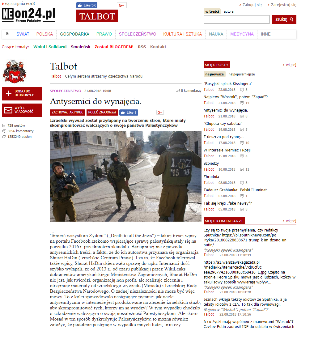 W dniu 21.08.2018, w portalu NEON24.pl doskonale tam znany i czytany blogger ksywa „Talbot” konsekrowany zawołaniem ”Talbot — Całym sercem strzeżmy dziedzictwa Narodu” zamieścił wpis – przedruk – szkalujący, oskarżający „Gazetę Warszawską” oraz Krzysztofa Cierpisza.