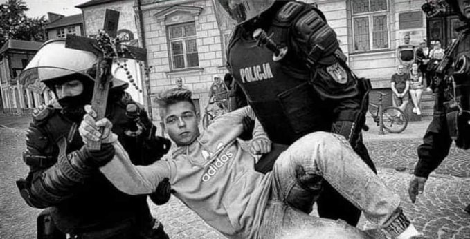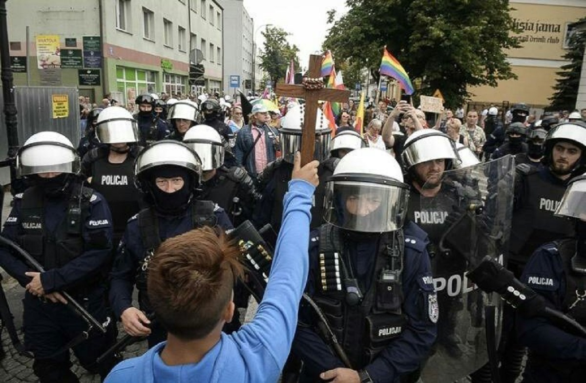 Policja uzbrojona w karabiny wymusza wolny pochód zboczeńcom seksualnym.