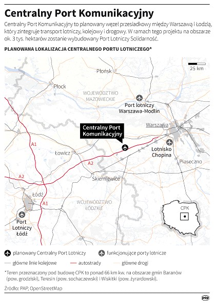Centralny Port Komunikacyjny to planowany węzeł przesiadkowy między Warszawą i Łodzią, który zintegruje transport lotniczy, kolejowy i drogowy. W ramach tego projektu w odległości 37 km na zachód od Warszawy, na obszarze ok. 3 tys. hektarów zostanie wybudowany Port Lotniczy Solidarność, który w pierwszym etapie będzie w stanie obsługiwać 45 mln pasażerów rocznie...w pobliżu są już cztery lotniska . CPK jest w 100 proc. własnością Skarbu Państwa, zaliczając się do spółek strategicznych z punktu widzenia interesów kraju. Zgodnie z zapowiedziami sam port powinien być zbudowany do końca 2027 r....
