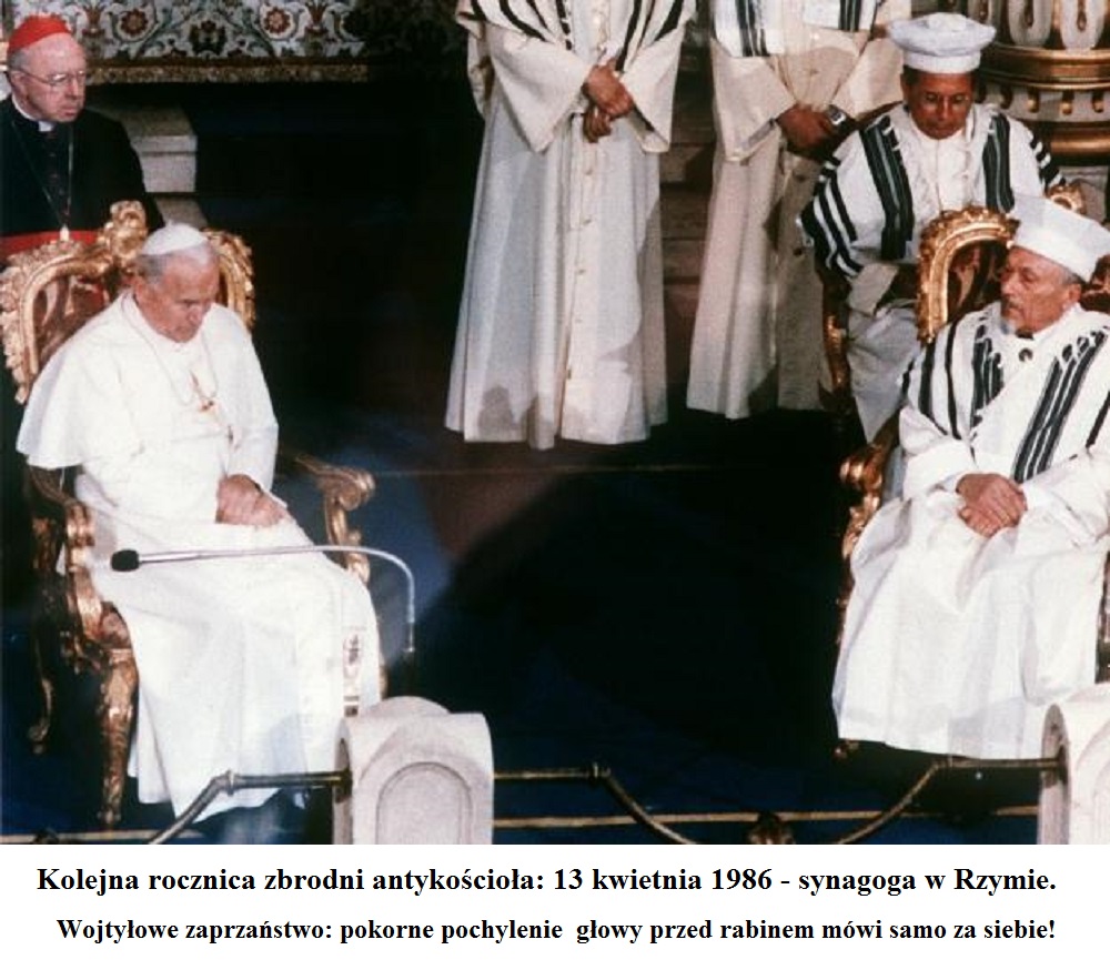 W Rzymie JPII poszedł do synagogi i tam kajał się przed żydami, potępił przedpoborowe nauczanie Kościoła, a więc poprzednich papieży. Co skutkiem prawa jego samego ekskomunikowało z Kościoła. To zgorszenie w synagodze doprowadziło do napadu żydowskiego w Oświęcimiu, na klasztor karmelitanek na Żwirowisku. Po dwóch tygodniach po wizycie w synagodze żydzi – którzy w tym celu specjalnie przybyli z USA – napadli na zakonnice na Żwirowisku, a rzucając kamieniami w klasztor otwarcie zażądali od papieża wyrzucenia Sióstr i zlikwidowania klasztoru. JPII oczywiście popadł w głęboką zadumę i po miesiącach wydał głęboką przemyślaną decyzję, że Karmelitanki powinny ustąpić i się wynosić – z ich własnego domu!!! Oczywiście podczas tej zadumy, Wojtyła doszedł do jeszcze bardziej troskliwych myśli, zadecydował, że siostry będą przeniesione do nowego miejsca „Centrum Dialogu i Modlitwy”, które to budynki będą wybudowane na koszt wdowiego grosza z tacy polskiego Kościoła, a te siostry karmelitanki będą tam usługiwać żydom, którzy je właśnie wypędzili z klasztoru. Większego diabelskiego szyderstwa, nawet najgorsze dno piekła by nie wymyśliło. A ta żydowska wrażliwość religijna była Siostrom szczególnie bolesna, bo ich bardzo surowa reguła zakazuje im kontaktów ze światem zewnętrznym, mają modlić się, milczeć i uprawiać ogródek. A tu Jan Paweł II dorzucił im obowiązek usługiwania żydom!