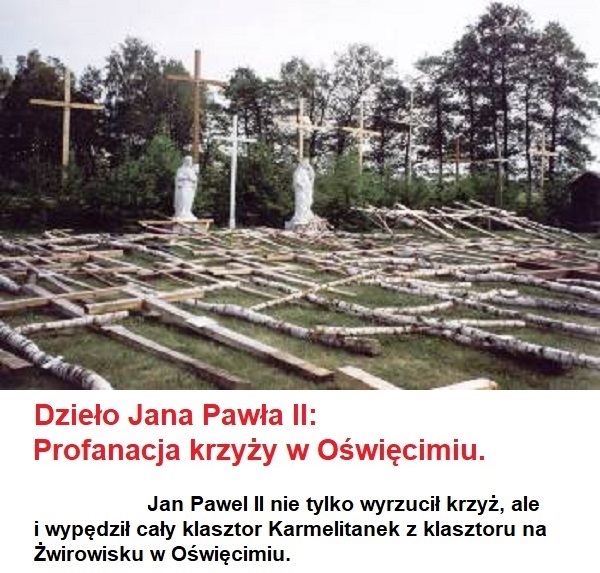 Jan Paweł II podczas swego b. długiego pontyfikatu dokonał ogromnych zniszczeń w całym Kościele, a co szczególnie lokalnie w Polsce odbiło się tak na naszej religijności, jak i zbiorowej psychice - na naszej polskiej zbiorowej psychice, a nawet na naszej zdolności postrzegania rzeczywistości i emocjonalności społecznej. A właśnie szczególnie w Polsce, szczególnie w Oświęcimiu, mistycznie -  gdzie żydówka Azari bezprzykładnie znieważyła to męczeńskie miejsce umęczonych narodów – a gdzie, jako wyrafinowany prestidigitator i nieświadomy naturszczyk zła, Jan Paweł II, wypędzając zakonnice z ich domu – dopuścił się świętokradztwa w Kościele i złamania polskiego, świeckiego prawa karnego – za to drugie powinien być ścigany przez polski wymiar sprawiedliwości. Bo nie mniej, nie więcej, tylko wypędził zakonnice z ich mieszkania! Nawet powściągliwi w wypowiedziach komentarzowy tamtego okresu – konfliktu na Żwirowisku zauważali, że do tej pory tylko okupanci i zaborcy likwidowali polskie kościoły czy klasztory. Czyli zaliczono Jana Pawła II w poczet wrogów Polski.