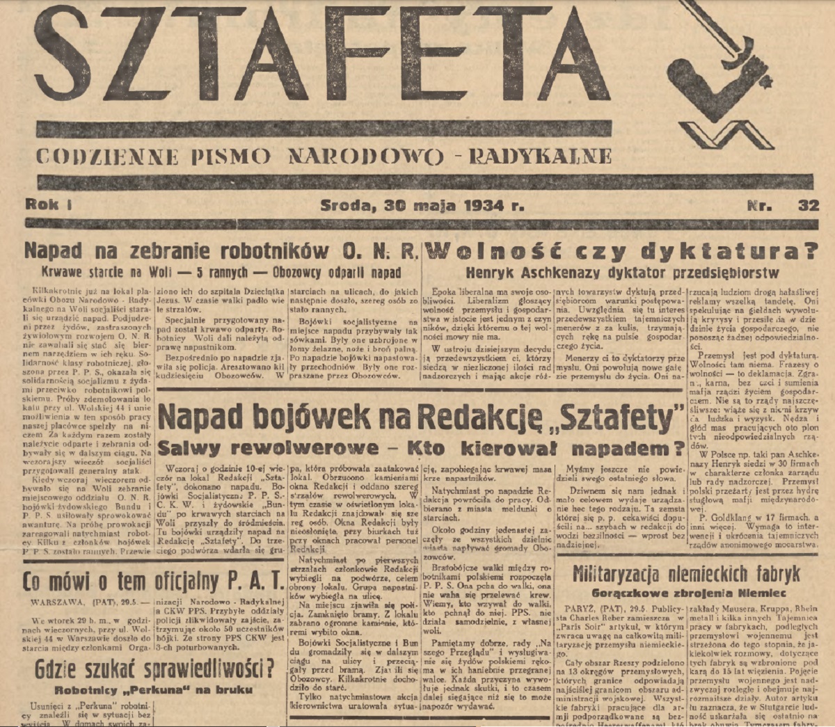 Na krzyk napadniętej nadbiegł Wójcik, przeciw któremu zwróciła się zaciekłość żydostwa. Napadnięty wystrzelił na postrach w górę z rewolweru, pomimo tego jednak żydostwo pobiło go do nieprzytomności odważnikami, deskami na bitem i gwoźdźmi i łomami. Nieszczęśliwego wydarł z rąk rozbestwionego żydowstwa patrol P. P. VII komisarjatu. Kuracja pobitego ciągnęła się przez 7 miesięcy i kosztowała go około 5000 zł., wskutek doznanych obrażeń, jak odbite płuca, nerki i in., stał się niezdolnym do pracy i zmuszonym do likwidacji interesu. Napastnicy, którzy w liczbie 10-ciu byli aresztowani, zostali przez sąd zwolnieni od winy i kary. Wójcik, znajdujący się w skrajnej nędzy, z powodu utraty możności zarobkowania, postanowił odwołać się do Ministra Sprawiedliwości z prośbą o ukaranie winnych jego nędzy Pomimo jednak, że podanie jego zostało złożone w Ministerstwie dn. 2 września 1933 r. do dziś dnia nie o trzymał żadnej odpowiedzi.
