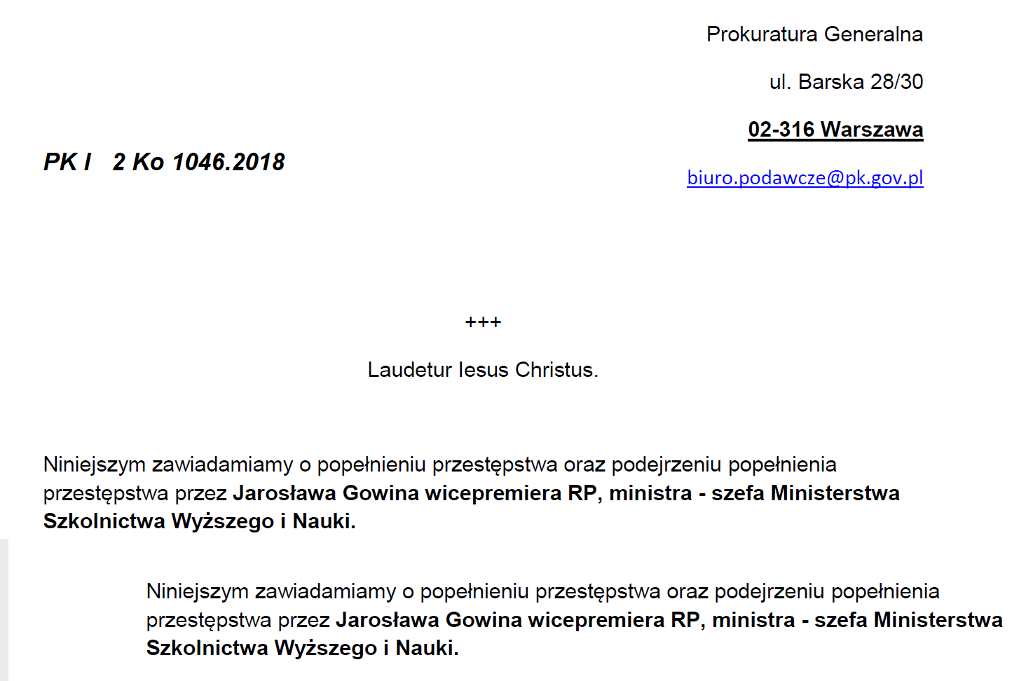 Niniejszym zawiadamiamy o popełnieniu przestępstwa oraz podejrzeniu popełnienia przestępstwa przez Jarosława Gowina wicepremiera RP, ministra - szefa Ministerstwa Szkolnictwa Wyższego i Nauki.