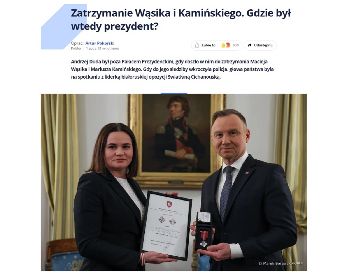 Policja weszła do Pałacu Prezydenckiego po godzinie 19.00 i zatrzymała przebywających tam Macieja Wąsika i Mariusza Kamińskiego. Do zatrzymania doszło, kiedy prezydent był na spotkaniu z liderką białoruskiej opozycji Swiatłaną Cichanouską w Belwederze. Jak słyszymy, mundurowi weszli do jednego z gabinetów, zabrali parlamentarzystom telefony i wyprowadzili ich z Pałacu.