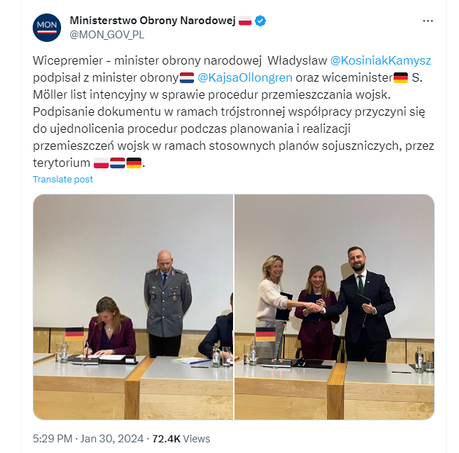 Wicepremier, minister obrony narodowej Władysław Kosiniak-Kamysz podpisał we wtorek w Brukseli list intencyjny z minister obrony Holandii Kajsą Ollongren i wiceminister obrony Niemiec Siemtje Möller w sprawie procedur przemieszczania wojsk. Podpisanie dokumentu ma przyczynić się do ujednolicenia procedur podczas planowania i realizacji przemieszczeń jednostek wojskowych przez terytorium trzech krajów.