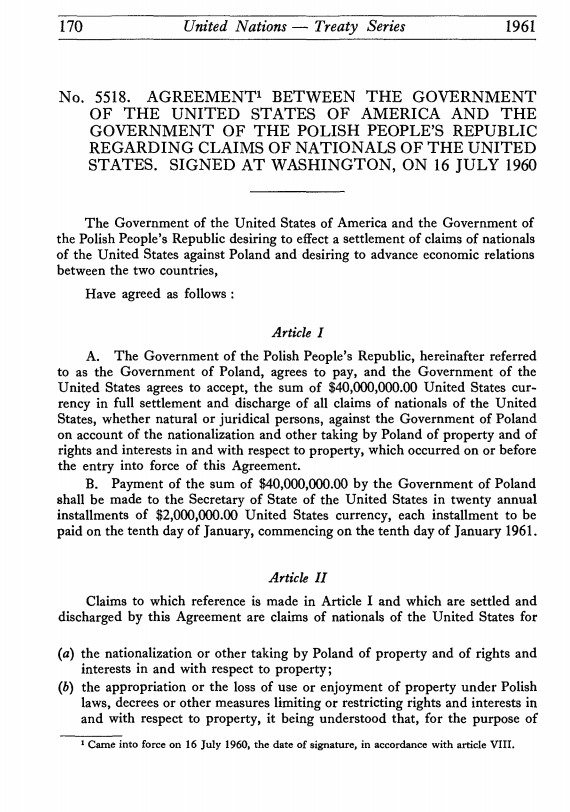 Article I A. The Government of the Polish People’s Republic, hereinafter referred to as the Government of Poland, agrees to pay, and the Government of the United States agrees to accept, the sum of $40,000,000.00 United States currency in full settlement and discharge of all claims of nationals of the United States, whether natural or juridical persons, against the Government of Poland on account of the nationalization and other taking by Poland of property and of rights and interests in and with respect to property, which occurred on or before the entry into force of this Agreement. B. Payment of the sum of $40,000,000.00 by the Government of Poland shall be made to the Secretary of State of the United States in twenty annual installments of $2,000,000.00 United States currency, each installment to be paid on the tenth day of January, commencing on the tenth day of January 1961. |