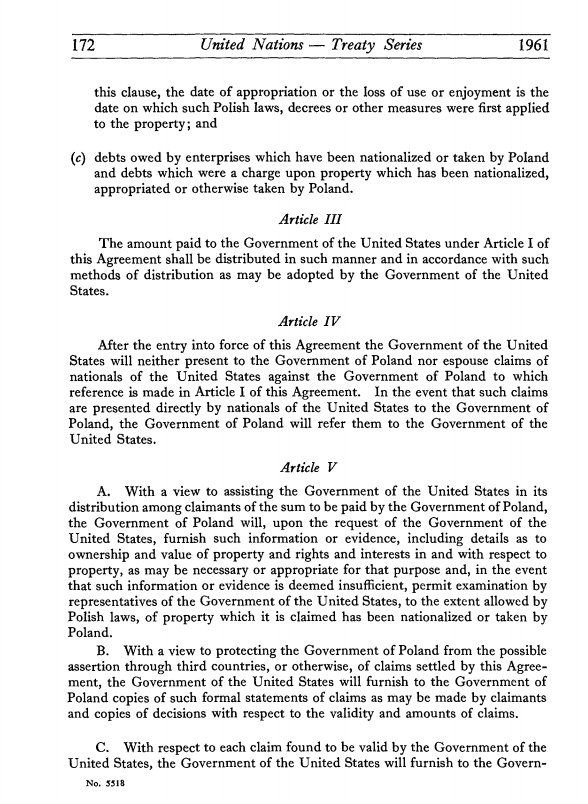 this clause, the date of appropriation or the loss of use or enjoyment is the date on which such Polish laws, decrees or other measures were first applied to the property; and (c) debts owed by enterprises which have been nationalized or taken by Poland and debts which were a charge upon property which has been nationalized, appropriated or otherwise taken by Poland. Article III The amount paid to the Government of the United States under Article I of this Agreement shall be distributed in such manner and in accordance with such methods of distribution as may be adopted by the Government of the United States. |