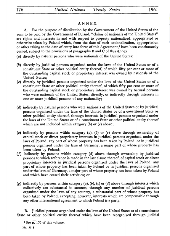 ANNEX A. For the purpose of distribution by the Government of the United States of the sum to be paid by the Government of Poland, “claims of nationals of the United States” are rights and interests in and with respect to property nationalized, appropriated or otherwise taken by Poland which, from the date of such nationalization, appropriation or other taking to the date of entry into force of this Agreement,1 have been continuously owned, subject to the provisions of paragraphs B and C of this Annex, (а) directly by natural persons who were nationals of the United States; (б) directly by juridical persons organized under the laws of the United States or of a constituent State or other political entity thereof, of which fifty per cent or more of the outstanding capital stock or proprietary interest was owned by nationals of the United States; (c) directly by juridical persons organized under the laws of the United States or of a constituent State or other political entity thereof, of which fifty per cent or more of the outstanding capital stock or proprietary interest was owned by natural persons who were nationals of the United States, directly, or indirectly through interests in one or more juridical persons of any nationality; (d) indirectly by natural persons who were nationals of the United States or by juridical persons organized under the laws of the United States or of a constituent State or other political entity thereof, through interests in juridical persons organized under the laws of the United States or of a constituent State or other political entity thereof which are not included within category (b) or (c) above; (e) indirectly by persons within category (a), (6) or (c) above through ownership of capital stock or direct proprietary interests in juridical persons organized under the laws of Poland, any part of whose property has been taken by Poland, or in juridical persons organized under the laws of Germany, a major part of whose property has been taken by Poland; (/) indirectly by persons within category (d) above through ownership by juridical persons to which reference is made in the last clause thereof, of capital stock or direct proprietary interests in juridical persons organized under the laws of Poland, any part of whose property has been taken by Poland or in juridical persons organized under the laws of Germany, a major part of whose property has been taken by Poland and which have ceased their activities; or (g) indirectly by persons within category (a), (6), (c) or (d) above through interests which collectively are substantial in amount, through any number of juridical persons organized under the laws of any country, a substantial part of whose property has been taken by Poland, excepting, however, interests which are compensable through any other international agreement to which Poland is a party. B. Juridical persons organized under the laws of the United States or of a constituent State or other political entity thereof which have been reorganized through judicial |