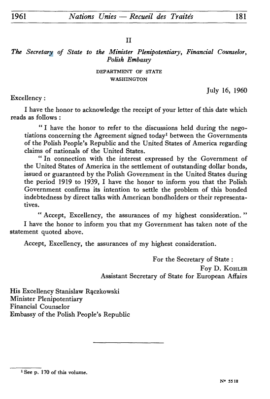 July 16, 1960 Excellency: I have the honor to acknowledge the receipt of your letter of this date which reads as follows : “ I have the honor to refer to the discussions held during the negotiations concerning the Agreement signed today1 between the Governments of the Polish People’s Republic and the United States of America regarding claims of nationals of the United States. “ In connection with the interest expressed by the Government of the United States of America in the settlement of outstanding dollar bonds, issued or guaranteed by the Polish Government in the United States during the period 1919 to 1939, I have the honor to inform you that the Polish Government confirms its intention to settle the problem of this bonded indebtedness by direct talks with American bondholders or their representatives. “ Accept, Excellency, the assurances of my highest consideration. ” I have the honor to inform you that my Government has taken note of the statement quoted above. Accept, Excellency, the assurances of my highest consideration. For the Secretary of State : Foy D. Kohler Assistant Secretary of State for European Affairs His Excellency Stanislaw Rączkowski Minister Plenipotentiary Financial Counselor Embassy of the Polish People’s Republic |