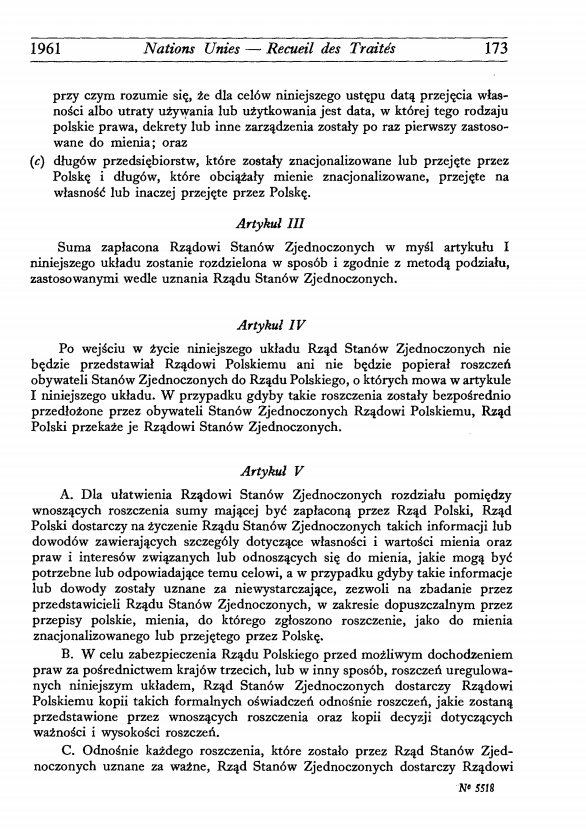Artykuł I A. Rząd Polskiej Rzeczypospolitej Ludowej, zwany dalej Rządem Polskim, zgadza się zapłacić a Rząd Stanów Zjednoczonych przyjąć sumę $ 40.000.000.- w walucie Stanów Zjednoczonych na całkowite uregulowanie i zaspokojenie wszystkich roszczeń obywateli Stanów Zjednoczonych, zarówno osób fizycznych jak prawnych, do Rządu Polskiego z tytułu nacjonalizacji i innego rodzaju przejęcia przez Polskę mienia oraz praw i interesów związanych lub odnoszących się do mienia, które miało miejsce w dniu lub przed dniem wejścia w życie niniejszego układu. B. Zapłata przez Rząd Polski sumy $ 40.000.000.- będzie dokonana do rąk Sekretarza Stanu Stanów Zjednoczonych w dwudziestu rocznych ratach po $ 2.000.000.- w walucie Stanów Zjednoczonych, przy czym każda rata powinna być uiszczona w dziesiątym dniu stycznia, poczynając od dnia dziesiątego stycznia 1961 roku. |