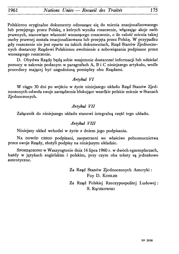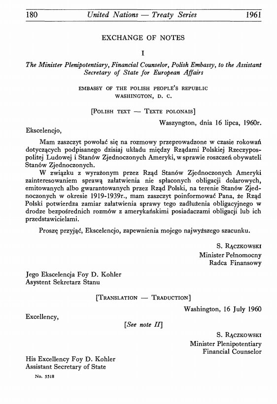 [Polish text — Texte polonais] Waszyngton, dnia 16 lipca, 1960r. Ekscelencjo, Mam zaszczyt powołać się na rozmowy przeprowadzone w czasie rokowań dotyczących podpisanego dzisiaj układu między Rządami Polskiej Rzeczypospolitej Ludowej i Stanów Zjednoczonych Ameryki, w sprawie roszczeń obywateli Stanów Zjednoczonych. W związku z wyrażonym przez Rząd Stanów Zjednoczonych Ameryki zainteresowaniem sprawą załatwienia nie spłaconych obligacji dolarowych, emitowanych albo gwarantowanych przez Rząd Polski, na terenie Stanów Zjednoczonych w okresie 1919-1939r., mam zaszczyt poinformować Pana, że Rząd Polski potwierdza zamiar załatwienia sprawy tego zadłużenia obligacyjnego w drodze bezpośrednich rozmów z amerykańskimi posiadaczami obligacji lub ich przedstawicielami. Proszę przyjąć, Ekscelencjo, zapewnienia mojego najwyższego szacunku. S. Rączkowski Minister Pełnomocny Radca Finansowy Jego Ekscelencja Foy D. Kohler Asystent Sekretarz Stanu |
