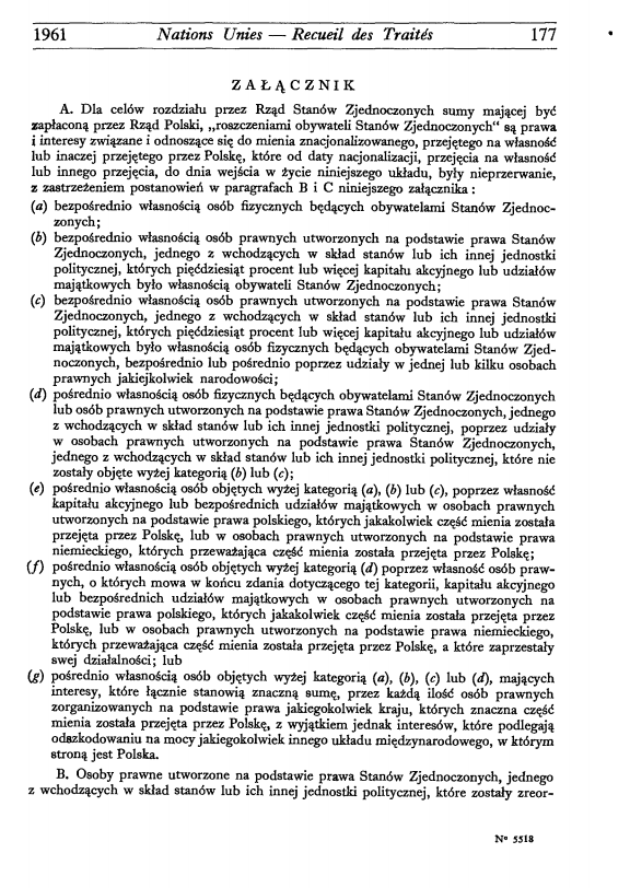 ZAŁĄCZNIK A. Dla celów rozdziału przez Rząd Stanów Zjednoczonych sumy mającej być zapłaconą przez Rząd Polski, „roszczeniami obywateli Stanów Zjednoczonych" są prawa i interesy związane i odnoszące się do mienia znacjonalizowanego, przejętego na własność lub inaczej przejętego przez Polskę, które od daty nacjonalizacji, przejęcia na własność lub innego przejęcia, do dnia wejścia w życie niniejszego układu, były nieprzerwanie, z zastrzeżeniem postanowień w paragrafach B i C niniejszego załącznika: (a) bezpośrednio własnością osób fizycznych będących obywatelami Stanów Zjednoczonych; (b) bezpośrednio własnością osób prawnych utworzonych na podstawie prawa Stanów Zjednoczonych, jednego z wchodzących w skład stanów lub ich innej jednostki politycznej, których pięćdziesiąt procent lub więcej kapitału akcyjnego lub udziałów majątkowych było własnością obywateli Stanów Zjednoczonych; (c) bezpośrednio własnością osób prawnych utworzonych na podstawie prawa Stanów Zjednoczonych, jednego z wchodzących w skład stanów lub ich innej jednostki politycznej, których pięćdziesiąt procent lub więcej kapitału akcyjnego lub udziałów majątkowych było własnością osób fizycznych będących obywatelami Stanów Zjednoczonych, bezpośrednio lub pośrednio poprzez udziały w jednej lub kilku osobach prawnych jakiejkolwiek narodowości; (d) pośrednio własnością osób fizycznych będących obywatelami Stanów Zjednoczonych lub osób prawnych utworzonych na podstawie prawa Stanów Zjednoczonych, jednego z wchodzących w skład stanów lub ich innej jednostki politycznej, poprzez udziały w osobach prawnych utworzonych na podstawie prawa Stanów Zjednoczonych, jednego z wchodzących w skład stanów lub ich innej jednostki politycznej, które nie zostały objęte wyżej kategorią (b) lub (c); (e) pośrednio własnością osób objętych wyżej kategorią (a), (b) lub (c), poprzez własność kapitału akcyjnego lub bezpośrednich udziałów majątkowych w osobach prawnych utworzonych na podstawie prawa polskiego, których jakakolwiek część mienia została przejęta przez Polskę, lub w osobach prawnych utworzonych na podstawie prawa niemieckiego, których przeważająca część mienia została przejęta przez Polskę; (f) pośrednio własnością osób objętych wyżej kategorią (d) poprzez własność osób prawnych, o których mowa w końcu zdania dotyczącego tej kategorii, kapitału akcyjnego lub bezpośrednich udziałów majątkowych w osobach prawnych utworzonych na podstawie prawa polskiego, których jakakolwiek część mienia została przejęta przez Polskę, lub w osobach prawnych utworzonych na podstawie prawa niemieckiego, których przeważająca część mienia została przejęta przez Polskę, a które zaprzestały swej działalności; lub (g) pośrednio własnością osób objętych wyżej kategorią (a), (b), (c) lub (d), mających interesy, które łącznie stanowią znaczną sumę, przez każdą ilość osób prawnych zorganizowanych na podstawie prawa jakiegokolwiek kraju, których znaczna część mienia została przejęta przez Polskę, z wyjątkiem jednak interesów, które podlegają odszkodowaniu na mocy jakiegokolwiek innego układu międzynarodowego, w którym stroną jest Polska. B. Osoby prawne utworzone na podstawie prawa Stanów Zjednoczonych, jednego z wchodzących w skład stanów lub ich innej jednostki politycznej, które zostały zreor |