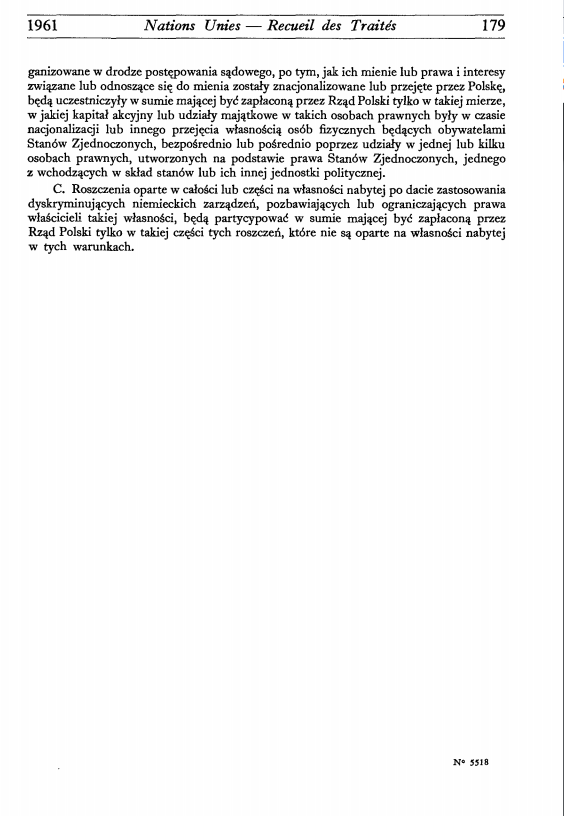 ganizowane w drodze postępowania sądowego, po tym, jak ich mienie lub prawa i interesy związane lub odnoszące się do mienia zostały znacjonalizowane lub przejęte przez Polskę, będą uczestniczyły w sumie mającej być zapłaconą przez Rząd Polski tylko w takiej mierze, w jakiej kapitał akcyjny lub udziały majątkowe w takich osobach prawnych były w czasie nacjonalizacji lub innego przejęcia własnością osób fizycznych będących obywatelami Stanów Zjednoczonych, bezpośrednio lub pośrednio poprzez udziały w jednej lub kilku osobach prawnych, utworzonych na podstawie prawa Stanów Zjednoczonych, jednego z wchodzących w skład stanów lub ich innej jednostki politycznej. C. Roszczenia oparte w całości lub części na własności nabytej po dacie zastosowania dyskryminujących niemieckich zarządzeń, pozbawiających lub ograniczających prawa właścicieli takiej własności, będą partycypować w sumie mającej być zapłaconą przez Rząd Polski tylko w takiej części tych roszczeń, które nie są oparte na własności nabytej w tych warunkach. |