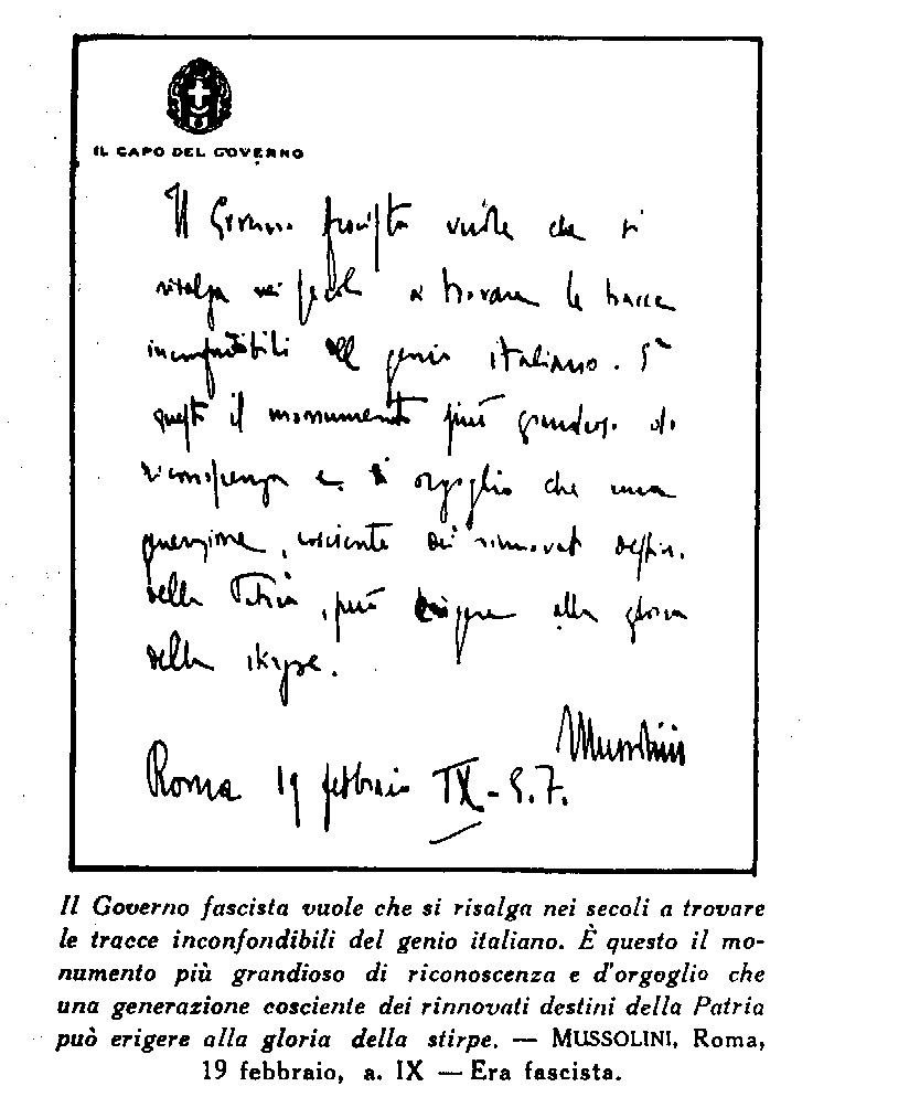 Rząd faszystowski chce, aby zzftrócono się w przeszłość w poszukiwaniu niezatartych śladów genjuszu włoskiego. Jest to najwspanialszy pomnik wdzięczności i dumy, który pokolenie świadome nowych przeznaczeń Ojczyzny może wznieść na chwałę szczepu — MUSSOLINI, Rzym, 19 lutego IX Ery faszystowskiej.