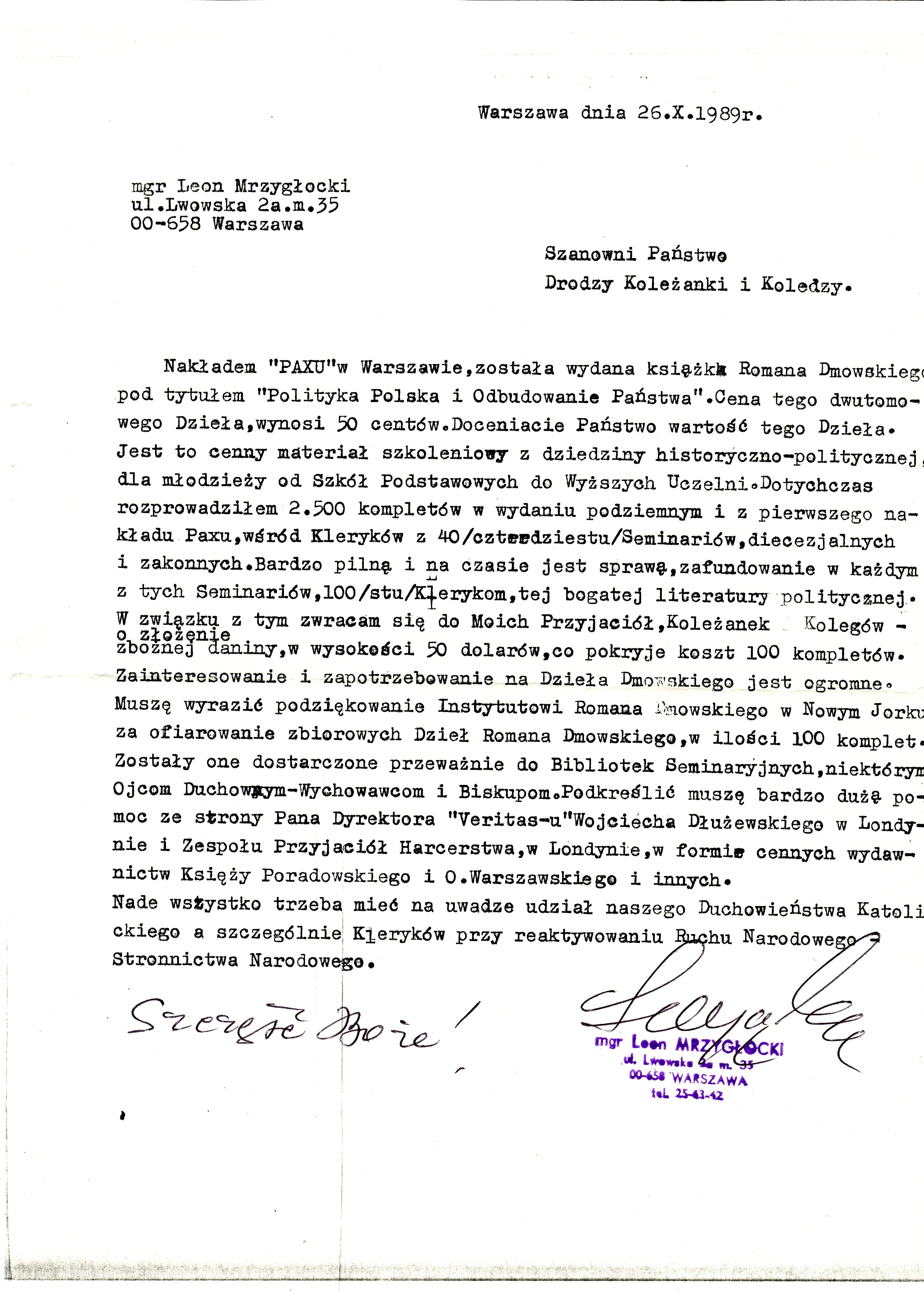 Bardzo pilną i na czasie jest sprawę, zafundowanie w każdym z tych Seminariów,100/stu Klerykom, tej bogatej literatury politycznej. W związku z tym zwracam się do Moich Przyjaciół Koleżanek Kolegów – o złożenie zbożnej daniny w wysokości 50 dolarów, co pokryje koszt 100 kompletów. Zainteresowanie i zapotrzebowanie na Dzieła Dmowskiego jest ogromne. Muszę wyrazić podziękowanie Instytutowi Romana lwowskiego w Nowym Jorki; za ofiarowanie zbiorowych Dzieł Romana Dmowskiego, w ilości 100 kompletów. Zostały one dostarczone przeważnie do Bibliotek Seminaryjnych, niektórym Ojcom Duchowym- Wychowawcom i Biskupom »Podkreślić muszę bardzo dużą po­moc ze strony Pana Dyrektora "Veritas-u" Wojciecha Dłużewskiego w Londy­nie i Zespołu Przyjaciół Harcerstwa, w Londynie, w formie cennych wydaw­nictw Księży Poradowskiego i 0.Warszawskiego i innych.