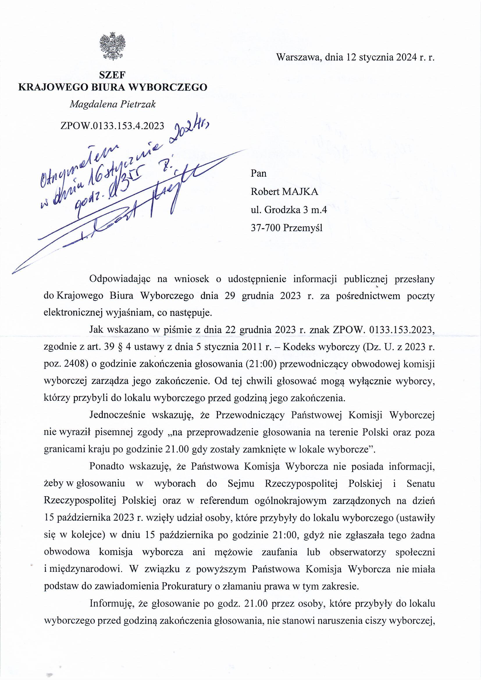 Pan Robert MAJKA 37-700 Przemyśl Odpowiadając na wniosek o udostępnienie informacji publicznej przesłany do Krajowego Biura Wyborczego dnia 29 grudnia 2023 r. za pośrednictwem poczty elektronicznej wyjaśniam, co następuje. Jak wskazano w piśmie z dnia 22 grudnia 2023 r. znak ZPOW. 0133.153.2023, zgodnie z art. 39 § 4 ustawy z dnia 5 stycznia 2011 r. - Kodeks wyborczy (Dz. U. z 2023 r. poz. 2408) o godzinie zakończenia głosowania (21:00) przewodniczący obwodowej komisji wyborczej zarządza jego zakończenie. Od tej chwili głosować mogą wyłącznie wyborcy, którzy przybyli do lokalu wyborczego przed godziną jego zakończenia. Jednocześnie wskazuję, że Przewodniczący Państwowej Komisji Wyborczej nie wyraził pisemnej zgody „na przeprowadzenie głosowania na terenie Polski oraz poza granicami kraju po godzinie 21.00 gdy zostały zamknięte w lokale wyborcze”. Ponadto wskazuję, że Państwowa Komisja Wyborcza nie posiada informacji, żeby w głosowaniu w wyborach do Sejmu Rzeczypospolitej Polskiej i Senatu Rzeczypospolitej Polskiej oraz w referendum ogólnokrajowym zarządzonych na dzień 15 października 2023 r. wzięły udział osoby, które przybyły do lokalu wyborczego (ustawiły się w kolejce) w dniu 15 października po godzinie 21:00, gdyż nie zgłaszała tego żadna obwodowa komisja wyborcza ani mężowie zaufania lub obserwatorzy społeczni i międzynarodowi. W związku z powyższym Państwowa Komisja Wyborcza nie miała podstaw do zawiadomienia Prokuratury o złamaniu prawa w tym zakresie. Informuję, że głosowanie po godz. 21.00 przez osoby, które przybyły do lokalu wyborczego przed godziną zakończenia głosowania, nie stanowi naruszenia ciszy wyborczej, o której mowa w art. 107 Kodeksu wyborczego. Wyborcy ci mogli bowiem zrealizować swoje czynne prawo wyborcze wprost na podstawie art. 39 § 4 Kodeksu wyborczego. A obwodowa komisja wyborcza miała obowiązek umożliwić im realizację ich praw konstytucyjnych. |