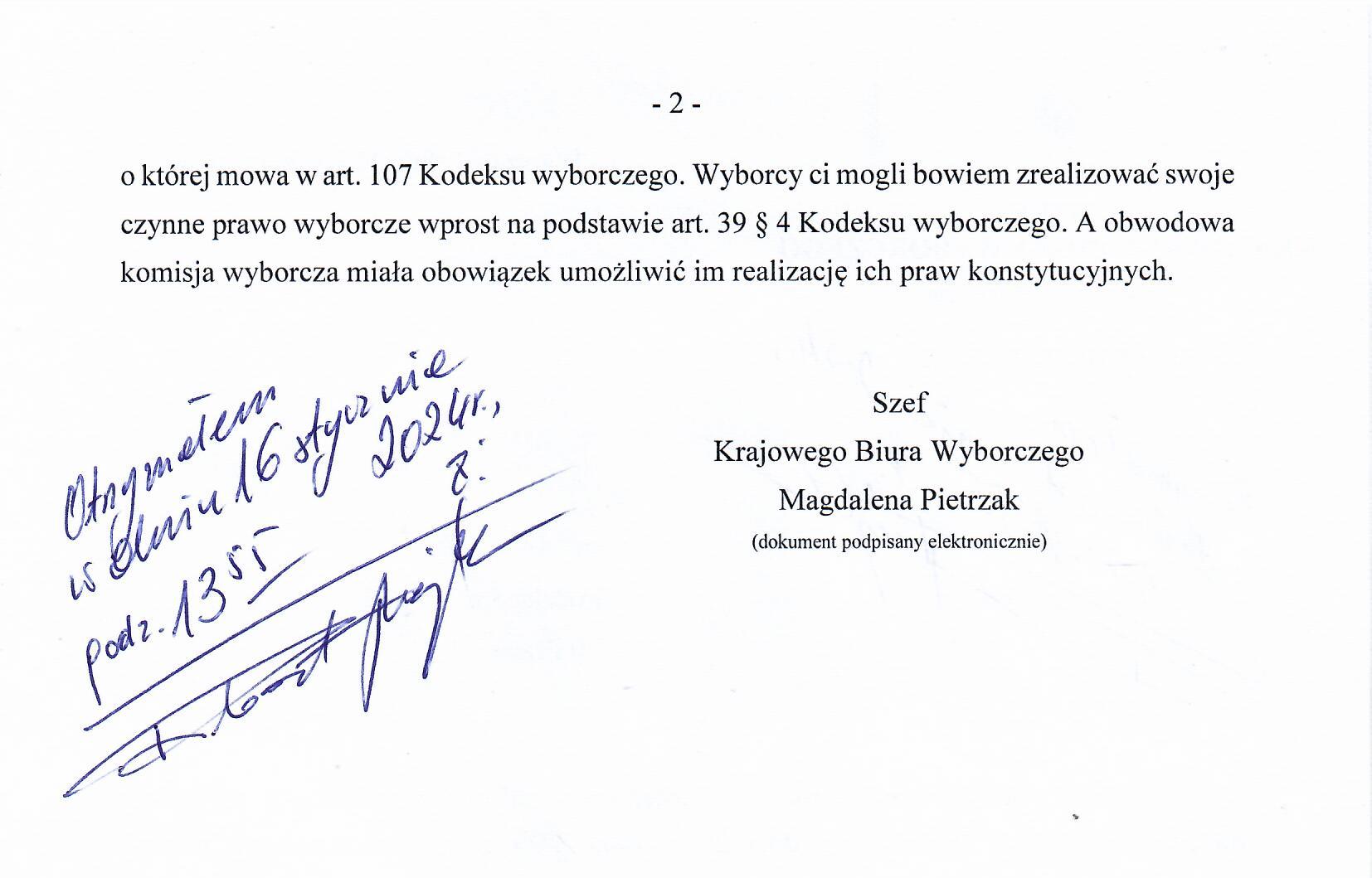 Przesyłam w załączeniu odpowiedź znak: ZPOW.0133.155.4.2023 z dnia 12 stycznia 2024 z Krajowego Biura Wyborczego na wniosek o udostępnienie informacji publicznej z dnia 29 grudnia 2023r., w formacie jpg. str.1 i 2