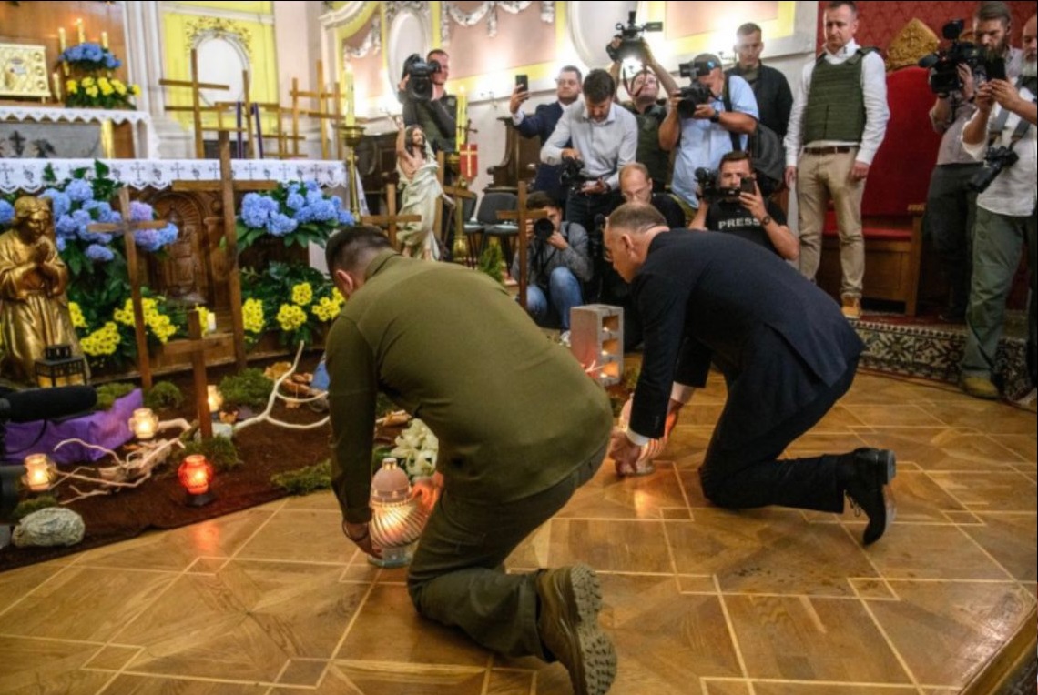 Duda-idiota bezcześci katolicki kościół obrzezanym rezunem Żeleńskim. Duda oddał hołd banderowcom, a nie Polakom - faktycznie.