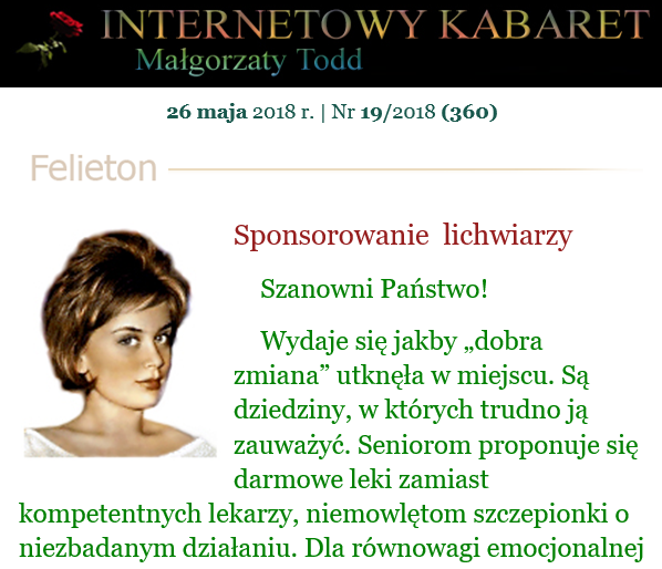 Wydaje się jakby „dobra zmiana” utknęła w miejscu. Są dziedziny, w których trudno ją zauważyć. Seniorom proponuje się darmowe leki zamiast kompetentnych lekarzy, niemowlętom szczepionki o niezbadanym działaniu. Dla równowagi emocjonalnej wciska nam się mnóstwo seriali opowiadających, jakich to mamy genialnych lekarzy. Pacjent odnosi zatem wrażenie, że może tylko on jakoś źle trafił.
