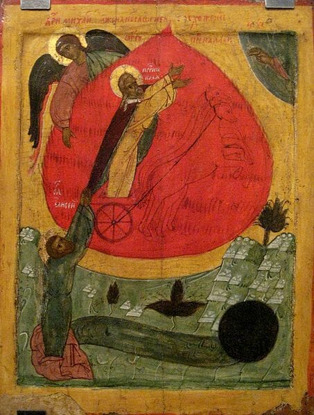 The next examples of water crossing that will bring all of our discussion back on itself are the Jordan crossings of Elijah and Elisha[14]. This happens in the same place as their ancestors, near Jericho, the first city taken by Joshua. Elijah uses his garment, which was a “hairy garment”[15], a garment of skin, to separate the waters and then leave this world bodily (just as Enoch did before the flood and Moses did before the entry into Canaan), and then Elisha, having received Elijah’s garments with a double portion of his power, used the garments of skin to return to the side of Jericho. This story is of course symbolically linked to the flood and the Ark, as well as to the crossing of Joshua and Caleb with the Ark of the covenant, and so when we put all of these together we have: giants, garments of skin, arks, dogs, foreigners, and “the savior” who wields all these things in order cross the chaotic waters. What we have before us is an image of baptism, but in a deeper way the image of St-Christopher with Christ on his back crossing the river is also an image of the Church itself.