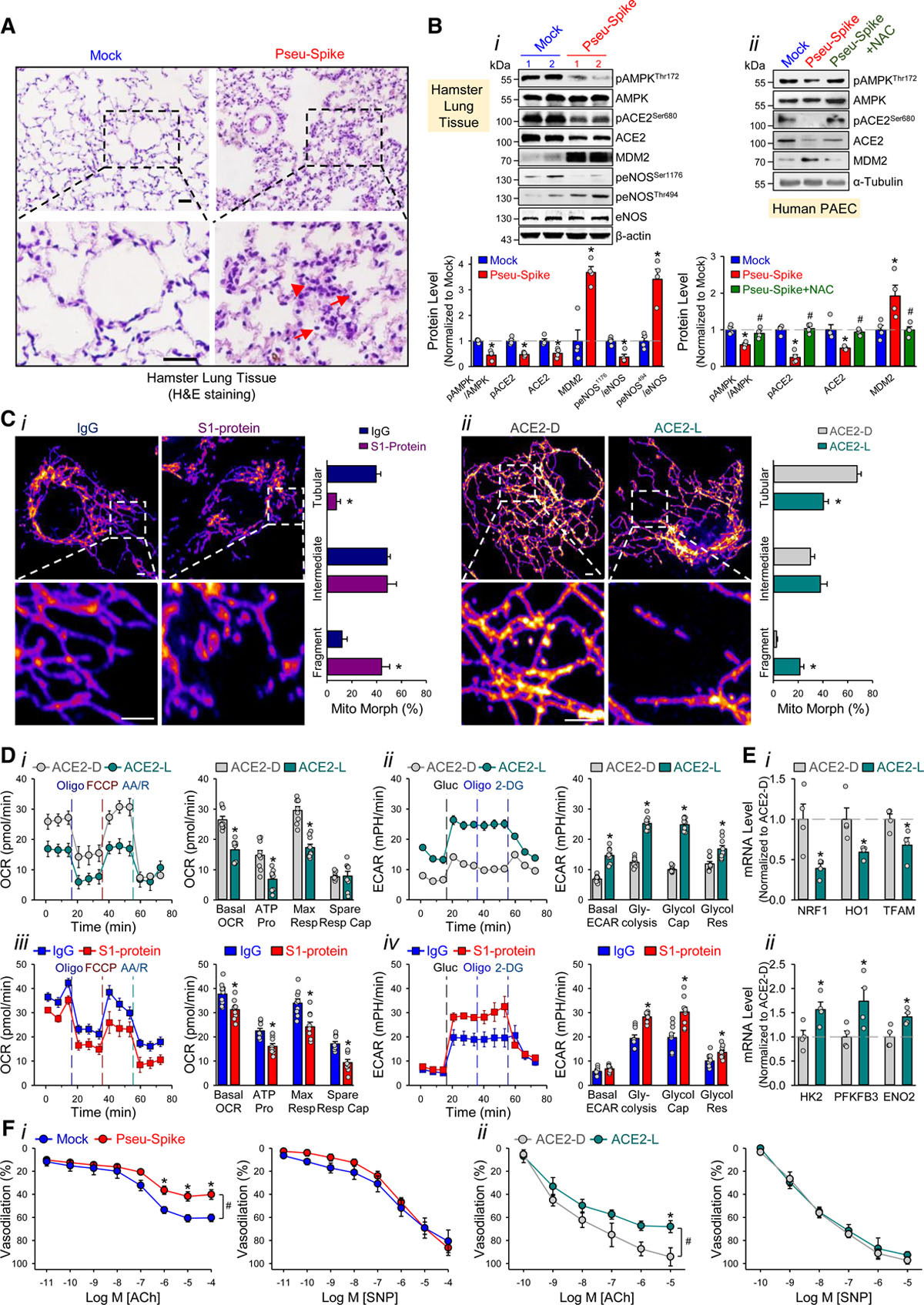 Figure. SARS-CoV-2 (Severe acute respiratory syndrome coronavirus 2) Spike protein exacerbates endothelial cell (EC) function via ACE (angiotensin-converting enzyme) 2 downregulation and mitochondrial impairment.A, Representative H&E histopathology of lung specimens from 8- to 12 wk-old male Syrian hamsters 5-day post administration of pseudovirus overexpressing Spike protein (Pseu-Spike) or mock virus in control group (n=3 mice per group, 1×108 PFU). Thickened alveolar septa (red arrowhead) and mononuclear cell (red arrow). Scale bar=20 μm. B, Pseu-Spike (n=4) or mock virus (n=4)–infected hamster lungs were subjected to Western blot analysis for pAMPK (phospho-AMPK) T172, AMPK, pACE2 (phospho angiotensin-converting enzyme) S680, ACE 2, MDM2, peNOS S1176, peNOS T494, eNOS (endothelial NO synthase), and β-actin (B, i). Human pulmonary arterial EC (PAECs) were infected with Pseu-Spike or mock virus for 24 h with or without N-acetyl-L-cysteine (NAC; 5 mmol/L) pretreatment for 2 h. The protein extracts were analyzed by Western blot using antibodies against proteins as indicated (n=4; B, ii). C, Representative confocal images of mitochondrial morphology of ECs treated with human recombinant S1 protein or IgG (4 μg/mL) for 24 h (C, i) or infected with human adenovirus ACE2 S680D (ACE2-D) or ACE2 S680L (ACE2-L; 10 MOI) for 48 h (C, ii). Mitochondria were visualized using TOM20 antibody (n=4, 50 cells counted for each replicate). Scale bar=2.5 μm. Tubular: the majority of mitochondria in ECs was >10 μm in length; Intermediate: the mitochondria were <≈10 μm; Fragment: the majority of mitochondria were spherical (no clear length or width). D, Measurement of oxygen consumption rate (OCR, D, i and iii) and extracellular acidification rate (ECAR, D, ii and iv) in ECs infected with ACE2-D vs ACE2-L (10 MOI) for 48 h (n=3) or treated with IgG vs S1 protein (4 μg/mL) for 24 h (n=3). E, Real-time quantitative polymerase chain reaction analysis of the indicated mRNA levels in lung ECs from ACE2-D (n=4) and ACE2-L (n=4) knock-in mice. Eight-week-old ACE2-D and ACE2-L male mice with C57BL/6 background were used. F, Dose-response curves of acetylcholine (ACh, left)- and sodium nitroprusside (SNP, right)–mediated relaxation on the tension of phenylephrine (1 μmol/L) precontracted intrapulmonary artery stripes from Pseu-Spike-(ACh n=8, SNP n=5) or mock (ACh n=6, SNP n=5) virus–infected Syrian hamsters (1×108 PFU; F, i) and ACE2-D (n=6) or ACE2-L (n=5) mice (F, ii). The animal experiments were approved by the ethical committee of Xi’an Jiaotong University. 2-DG indicates 2-Deoxy-D-glucose; ACE2-D, a phospho-mimetic ACE2 with increased stability; ACE2-L, a dephospho-mimetic ACE2 with decreased stability; AMPK, AMP-activated protein kinase; AA/R, antimycin A&Rotenone; ENO2, enolase 2; FCCP, carbonyl cyanide-p-(trifluoromethoxy)phenylhydrazone; H&E, Hematoxylin and Eosin; HK2, hexokinase 2; HO1, heme oxygenase-1; MDM2, murine double minute 2; MOI, multiplicity of infection; NRF1, nuclear respiratory factor 1; peNOS, phospho-eNOS; PFKFB3, 6-phosphofructo-2-kinase/fructose-2,6-biphosphatase 3; Resp, respiration; and TFAM, transcription factor A, mitochondrial.