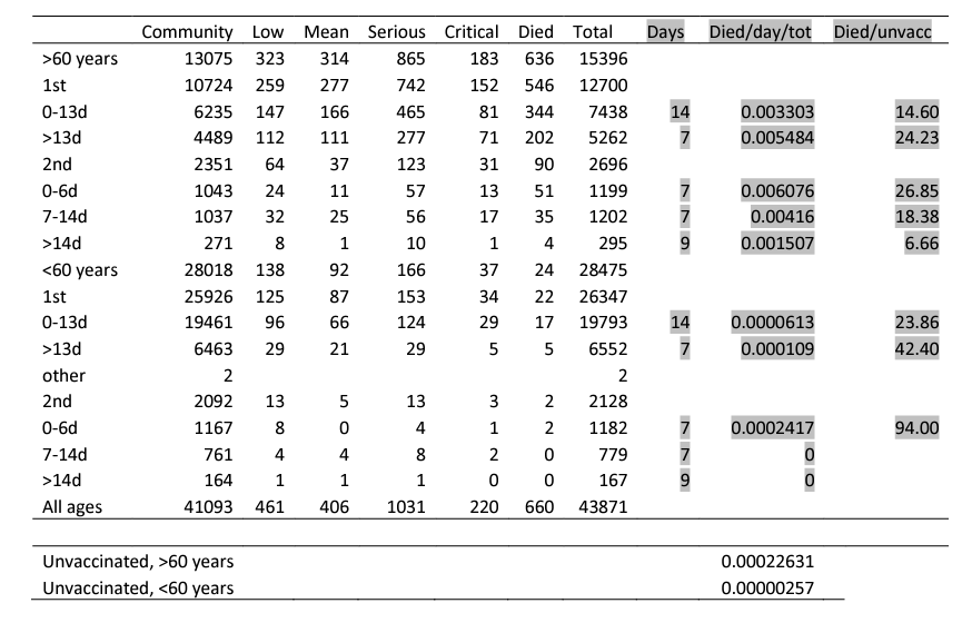 Przedstawiamy tutaj szczegółowo analizy kosztów dotyczące zgonów spowodowanych przez szczepienia COVID19 zgodnie z tabelą 1. W przypadku osób powyżej 60. roku życia w ciągu pierwszych 14 dni po podaniu pierwszej dawki zgony są 14,6 razy częstsze dziennie niż w przypadku osób niezaszczepionych.Oznacza to, że aby zrekompensować te nadmierne zgony, 14,6 x 14 dni = 204,4 dni bezwzględnej ochrony przed COVID19 jest konieczne, aby uzyskać korzyści netto w wysokości 0 dla tego pierwszego okresu po wstrzyknięciu pierwszej dawki. Podobne obliczenia pokazują, że przez trzeci tydzień po pierwszym wstrzyknięciu wyrównanie zwiększonej liczby zgonów w porównaniu z osobami niezaszczepionymi wymagałoby dodatkowych 24,23x7 dni = 169,61 dni pełnej ochrony szczepionki przed COVID19. Pierwszy tydzień po drugiej iniekcji wymaga 26,85x7 dni = 187,95 dni pełnej ochrony szczepionki przeciwko COVID19 w celu zrekompensowania nadmiernej liczby zgonów spowodowanych COVID19 w tym okresie. Drugi tydzień po wstrzyknięciu drugiej dawki wymaga 18,38x7 dni = 128,66 dni pełnej ochrony szczepionki. W sumie rekompensata, aby osiągnąć 0 kosztów i korzyści, wymaga 690. 62 pełna ochrona szczepionkowa przed COVID19 dla osób starszych. Należy pamiętać, że nie obejmuje to zgonów wywołanych przez szczepienia niezwiązanych z COVID19, a ochrona szczepionkowa nie jest absolutna.