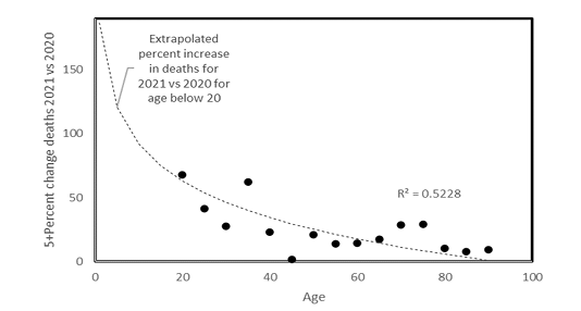 The relative increase in deaths for 2021 vs 2020 is highest for younger ages (Figure 2). Extrapolating to ages <20 (Figure 2), predicts increases in deaths for ages <20 that confirm the high vaccine-associated mortalities for the young observed in the VAERS data in Figure 1. Note that these are minimal values because such data are frequently updated up to 1 year after death.