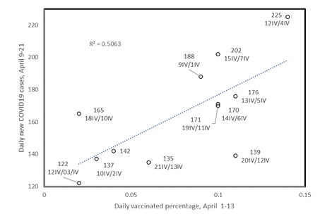 Figure 6. Daily new COVID19 cases (April 9-21) as a function of daily increase in vaccination percentage (April 1-13). Values near datapoints indicate new case numbers at the date indicated below the value, followed by the date of the vaccination percentage from the x-axis.