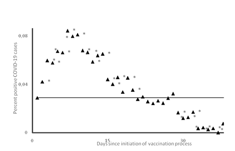 We test the predicted positive association between daily cases and daily vaccination rates by examining daily case numbers since vaccination project started on December 20 2020, data from worldometer, Israel COVID: 837,492 Cases and 6,346 Deaths - Worldometer (worldometers.info), and daily cumulative percentages of Israelis with at least one injection, Coronavirus (COVID-19) Vaccinations - Statistics and Research - Our World in Data, both accessed April 22 2021.
