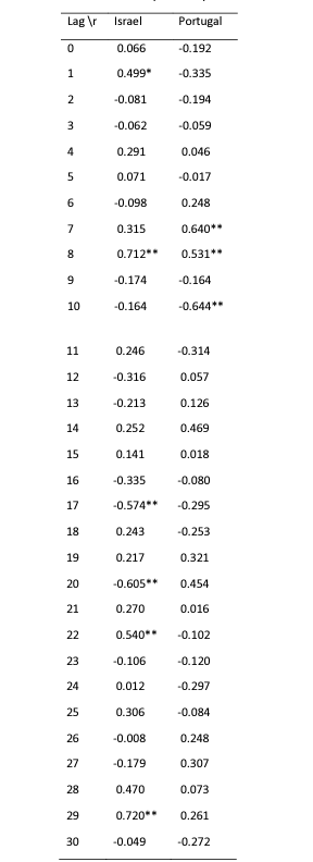 Tabela 4. Współczynnik korelacji Pearsona r między codziennymi nowymi izraelskimi przypadkami COVID (9-21 kwietnia) a dziennymi wzrostami odsetka szczepień w okresie wstecznym 13 kolejnych dni, począwszy od 21 kwietnia (kolumna 2), a dla danych z Portugalii (kwiecień 11-23, kolumna 3). *: P <0,05; **: P <0,05 skorygowany o wielokrotność testu (Benjamini i Hochberg 1995), testy 2-stronne.