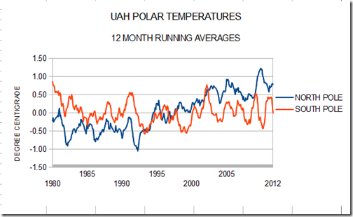 RYS.2.   12 MIESIĘCZNE BIEŻĄCE  ŚREDNIE TEMPERATURY DLA PÓŁNOCNEGO I POŁUDNIOWEGO BIEGUNA WEDŁUG UNIWERSYTETU ALABAMA W HUNTSVILLE  1980-2012