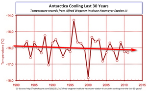 Australijska stacja meteorologiczna na Biegunie Południowym nadzorowana przez Newmayer Institute również donosi o zmianach temperatury atmosfery Ziemi w latach 1980-2012 [11]. Stacja ta odnotowała niewielki spadek temperatury atmosfery ziemskiej od 1980 do 2012 roku na biegunie południowym.