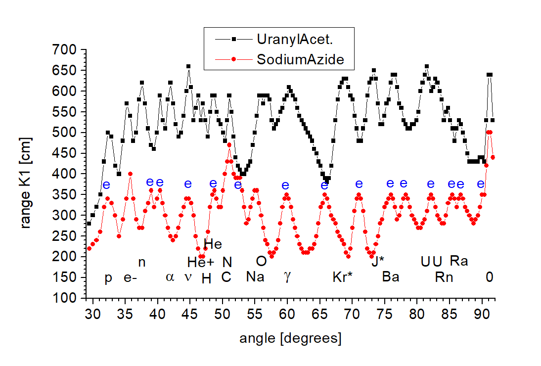 Rys. 6. Spektra sygnału cząstek pola torsyjnego pochodzące z octanu uranylu (cz. Przedsiębiorstwo wielobranżowe B&K) - czarne kwadraty i azydku sodowego (cz.d.a. Chempur) - czerwone kółka. Oznaczenia: p - protony, e- - elektrony, n - neutrony, α - cząstki alfa, ν - neutrina, He+ - zjonizowana czasteczka helu, He - hel, H - wodór, C - węgiel, N - azot, Na -sód, O - tlen, γ - promieniowanie gamma pochodzące od atomów uranu, J* promieniotwórczy izotop jodu z rozpadu uranu, Ba - bar z rozpadu uranu, U - dwa izotopy uranu 234U i 238U, Rn - radon z rozpadu uranu, Ra - rad, e - sygnał od orbitali potrójnego wiązania ugrupowania azydkowego, 0 - sygnał od nieodhylonego promienia zerowego. Oś odciętych - kąt wiązki padającej względem płaszczyzny łamiącej mierzony w stopniach; oś rzędnych - zasięg promieniowania Kategorii K1 z próbek na wyjściu spektroskopu mierzony w centymetrach.