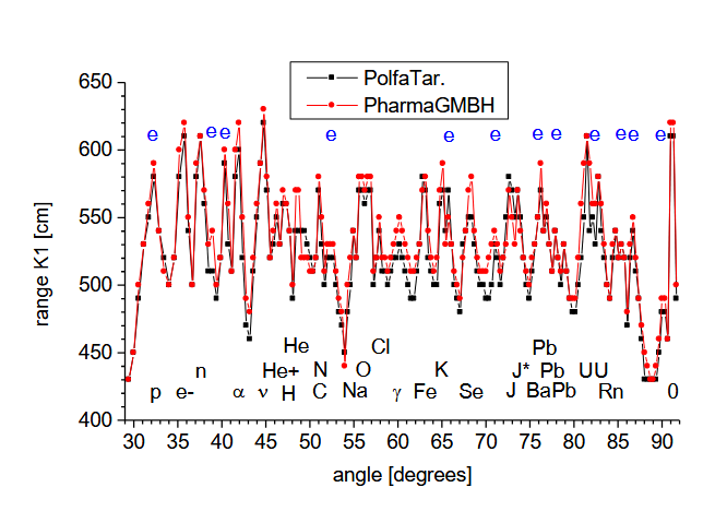 Rys. 5. Spektra sygnału cząstek pola torsyjnego pobranego z tabletek jodku potasu dwóch producentów: Polfa Tarchomin (czarne kwadraty) i Pharma GMBH (czerwone kółka). Oznaczenia: p - protony, e- - elektrony, n - neutrony, α - cząstki alfa, ν - neutrina, He+ - zjonizowana czasteczka helu, He - hel, H - wodór, C - węgiel, N - azot, Na -sód, O - tlen, Cl - chlor, γ - promieniowanie gamma w położeniu charakterystycznym dla atomów uranu, Fe -żelazo, K - potas, Se - selen, J - trwały izotop jodu, J* promieniotwórczy izotop jodu z rozpadu uranu, Ba - bar z rozpadu uranu, Pb trzy izotopy ołowiu, U -dwa izotopy uranu 234U i 238U, Rn - radon z rozpadu uranu, e - sygnał od orbitali potrójnego wiązania ugrupowania azydkowego, 0 - sygnał od nieodhylonego promienia zerowego. Oś odciętych - kąt wiązki padającej względem płaszczyzny łamiącej mierzony w stopniach; oś rzędnych - zasięg promieniowania Kategorii K1 z próbek na wyjściu spektroskopu mierzony w centymetrach.