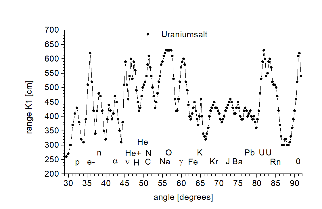 Rys. 8. Spektrum sygnału cząstek pola torsyjnego z wyciętego wydruku kryształka z obszaru B na rys. 1. Oznaczenia: p - protony, e- - elektrony, n - neutrony, α - cząstki alfa, ν - neutrina, He+ - zjonizowana czasteczka helu, He - hel, H - wodór, C - węgiel, N - azot, Na - sód, O - tlen, γ - promieniowanie gamma w położeniu charakterystycznym dla atomów uranu, Fe -żelazo, K - potas, Kr - krypton, J - jod, Ba - bar z rozpadu uranu, Pb - trzy izotopy ołowiu, U -dwa izotopy uranu 234U i 238U, Rn - radon z rozpadu uranu, 0 - sygnał od nieodhylonego promienia zerowego. Oś odciętych - kąt wiązki padającej względem płaszczyzny łamiącej mierzony w stopniach; oś rzędnych - zasięg promieniowania Kategorii K1 z próbek na wyjściu spektroskopu mierzony w centymetrach.