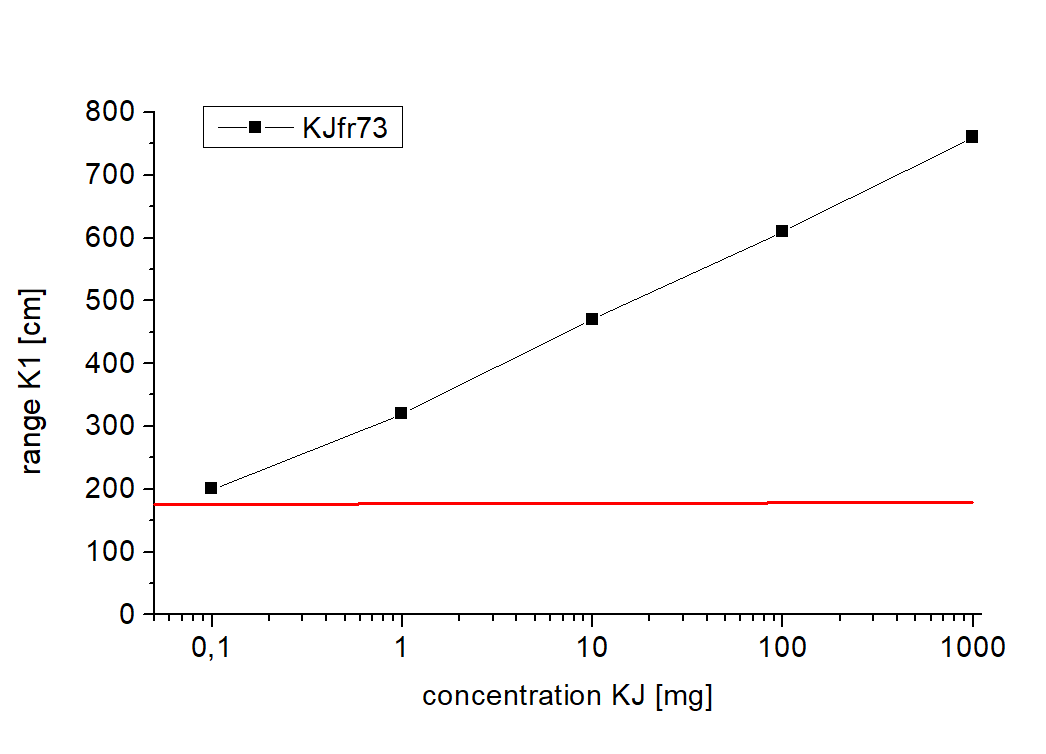 Skala zasięgu promieniowania dla wzorcowych stężeń jodku potasu