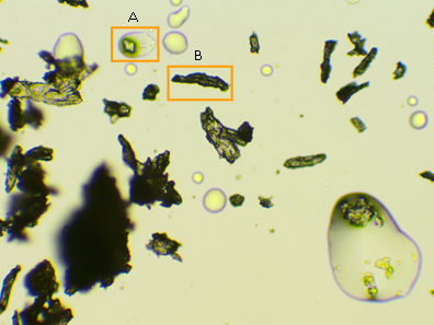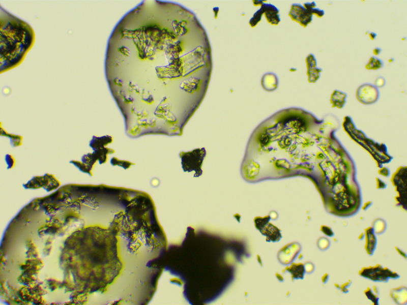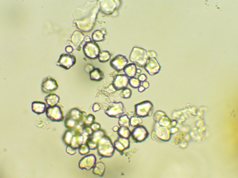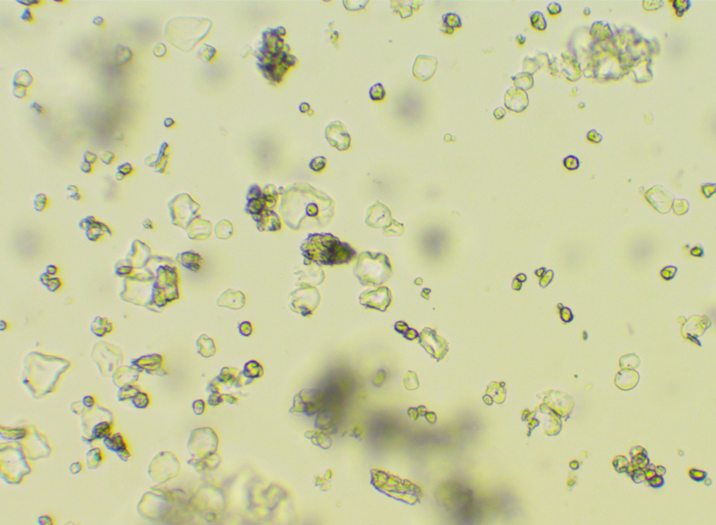 Zdjęcia mikroskopowe ujawniają niejednorodność substancji krystalicznych zawartych w tabletce Polfa Tarchomin, wskazując, że jest to mieszanina częściowo zmielonych kryształów. Występuje też pewna zawartość mikrokropelek cieczy.