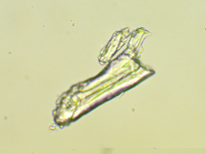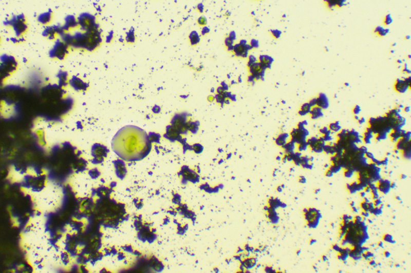 Rys. 3. pokruszona pastylka zawieszona w wodzie, pozostają nierozpuszczalne kryształy, obiektyw 10x